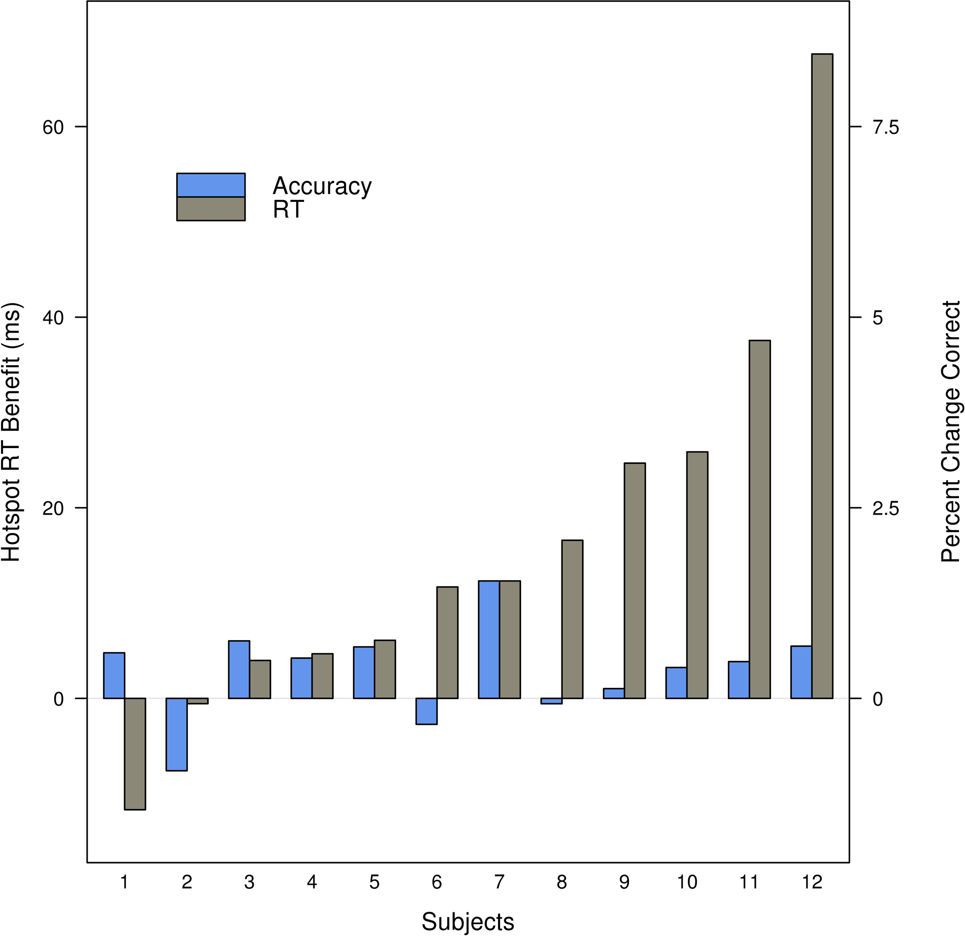 There is a benefit in RT and accuracy for individual participants when targets from the high-probability, hotspot, side are compared to targets from the low-probability side. Participants are ordered by the magnitude of the RT benefit. Trials with RT <150 ms or >1000 ms are excluded, and RT is computed for correct trials only.
