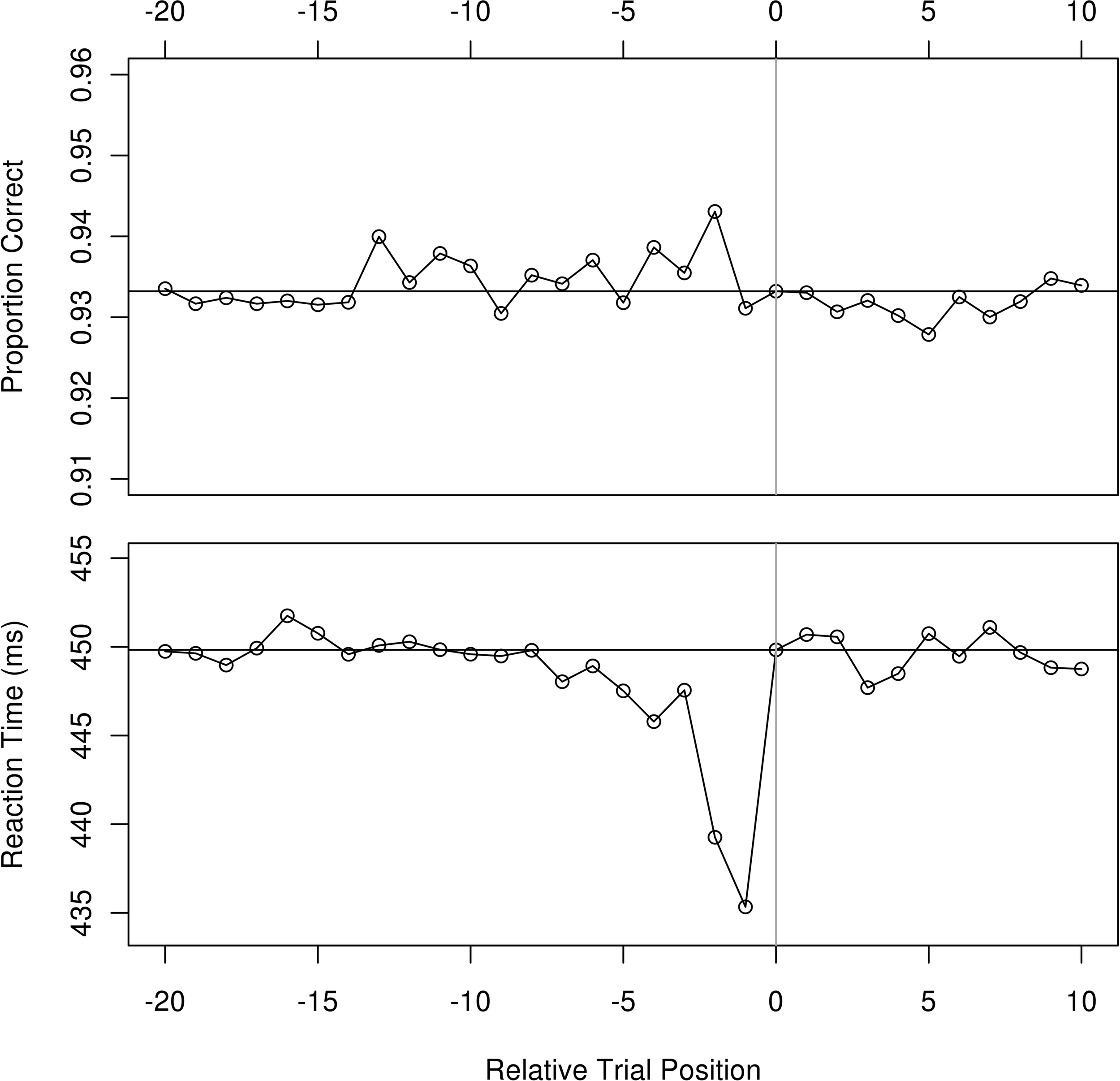 Since participants responded to targets that were equally likely to be red or green with consistent button presses, about one half of all trials involved a repeat of color and button press. We refer to this as stimulus–response priming. Figure 5 shows the stimulus–response priming effect for both RT and accuracy when the priming trial was “n” back, similar to the manner of presentation in Maljkovic and Nakayama (1996). Decreases in RT are evident for the preceding four trials and there is a suggestion of an improvement in accuracy as well, perhaps with an even longer time frame. Our LME model examined as the only factor whether the prior trial was of the same color and included the participants as a random effect. A repeat in the stimulus–response was associated with an average decrease in RT of 28 ms (p = 0.0001, 95% CI 25–32 ms).