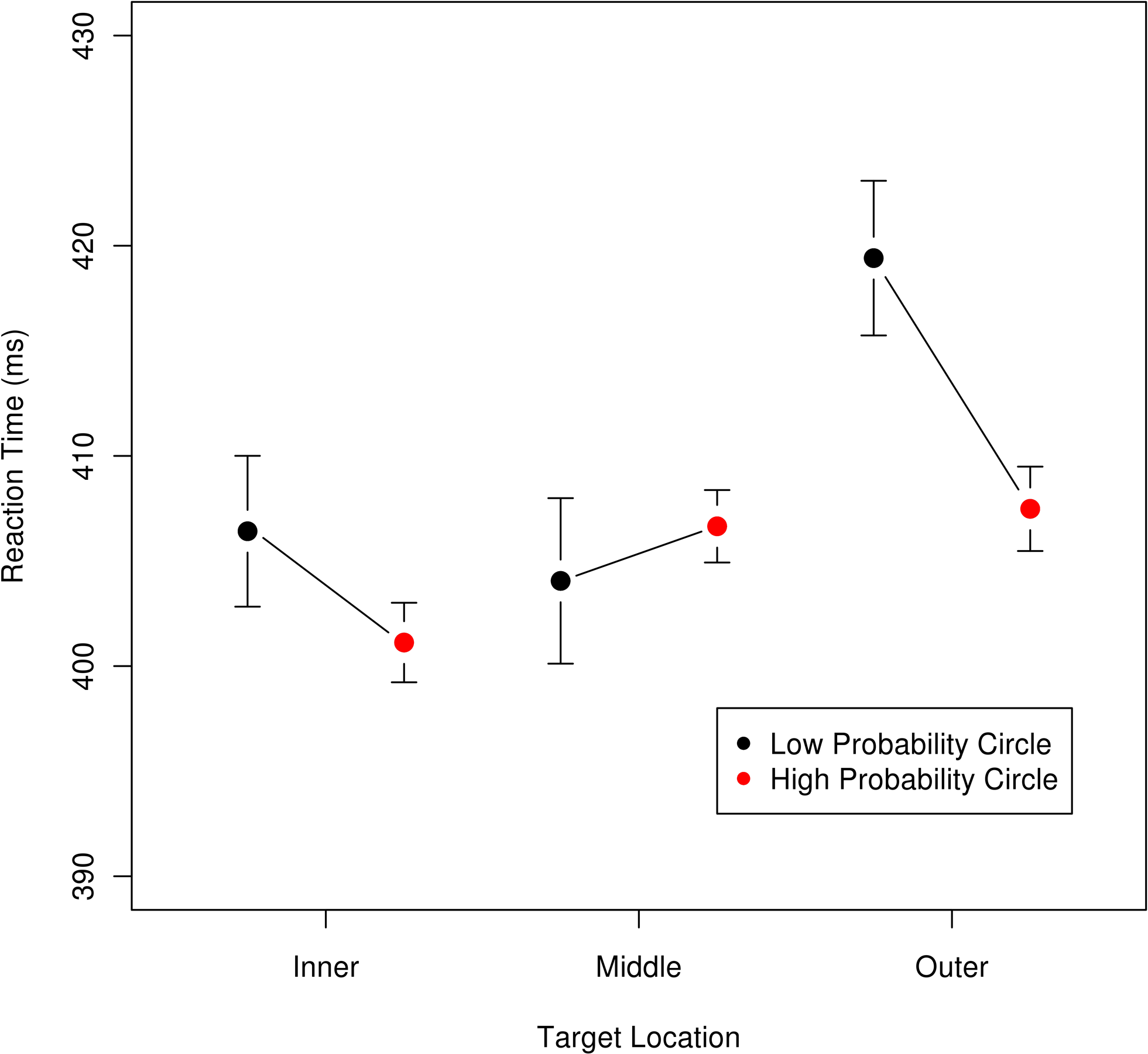 Mean reaction time as a function of target location and probability; error bars are 95% confidence intervals for each location × probability condition. Targets were either on the inner, middle, or outer circle. For each circle, the right (red) point is for the trials where that circle was the high-probability location, and the left (black) point is for trials where the circle was a low-probability location. This graph is intended to visualize the magnitude and directions of the effects and thus excludes the data from two participants who had mean RTs two standard deviations away from the sample mean. Statistical analyses reported in the text include the data from all participants.