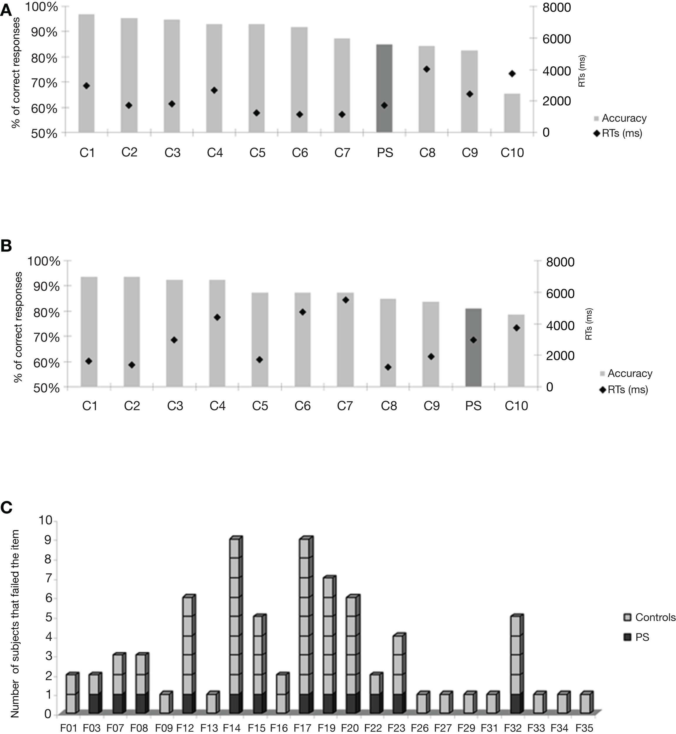 To compare PS’ behavioral performance to normal participants, the modified t-test of Crawford and Howell (1998) for single-case studies was used. Here we used a <0.05 p-value within the framework of a unilateral hypothesis. Analysis was performed with a computerized version of Crawford and Howell's method: SINGLIMS.EXE g(Crawford and Garthwaite, 2002).