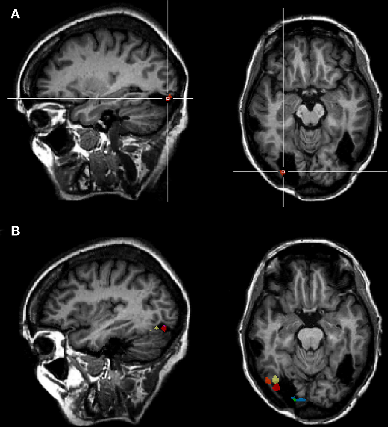 In summary, the missing components of the network of face-preferential activation in PS’ brain (left FFA and right OFA) were areas located in structurally damaged tissue (Figure 2). As shown previously (Rossion et al., 2003), the average localization of the right OFA in normal participants falls within the right inferior occipital lesion of the patient PS (Figure A2 of Appendix). Moreover, 9 out of the 11 individually localized right OFAs in the present study fall completely or largely within the territory of PS’ right inferior occipital lesion.