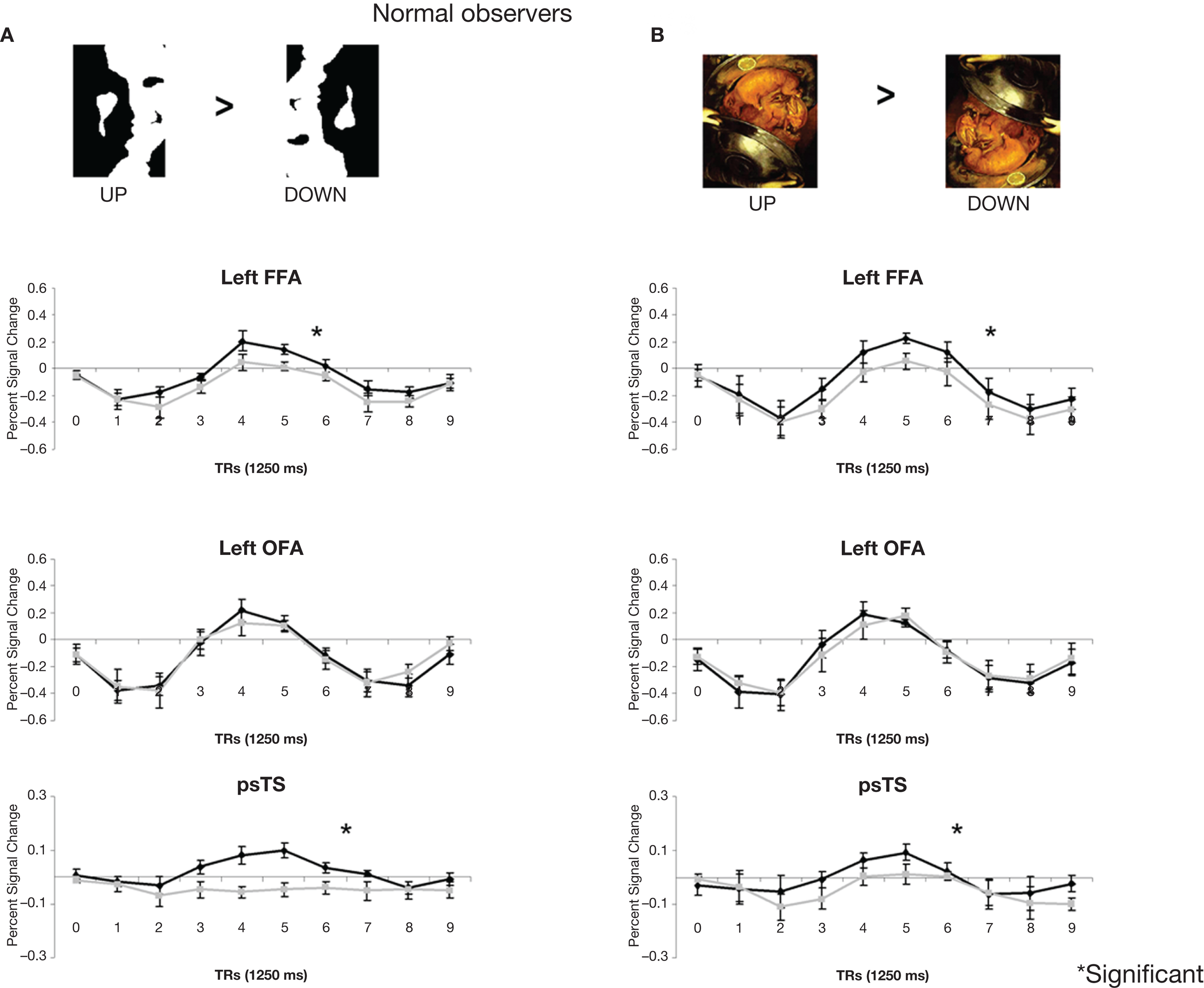(A) Time-course of activation in other face-sensitive regions for the group of normal participants in the Mooney face detection task. Note that in addition to the right pSTS, the left FFA showed a larger response to Mooney faces, which was not found in the left OFA, as in the right hemisphere (Figure 5). (B) The same results in the experiment with Arcimboldo stimuli.