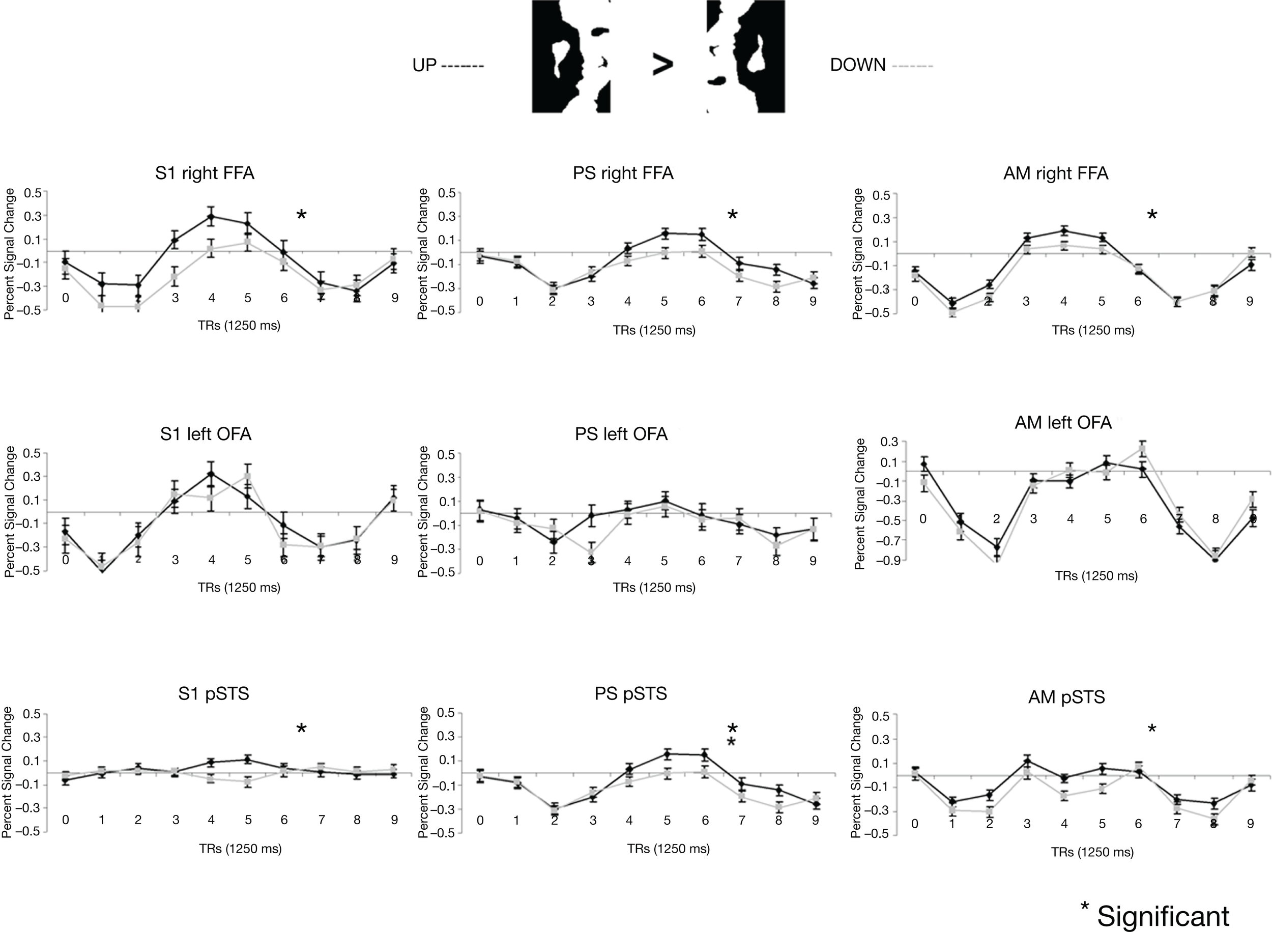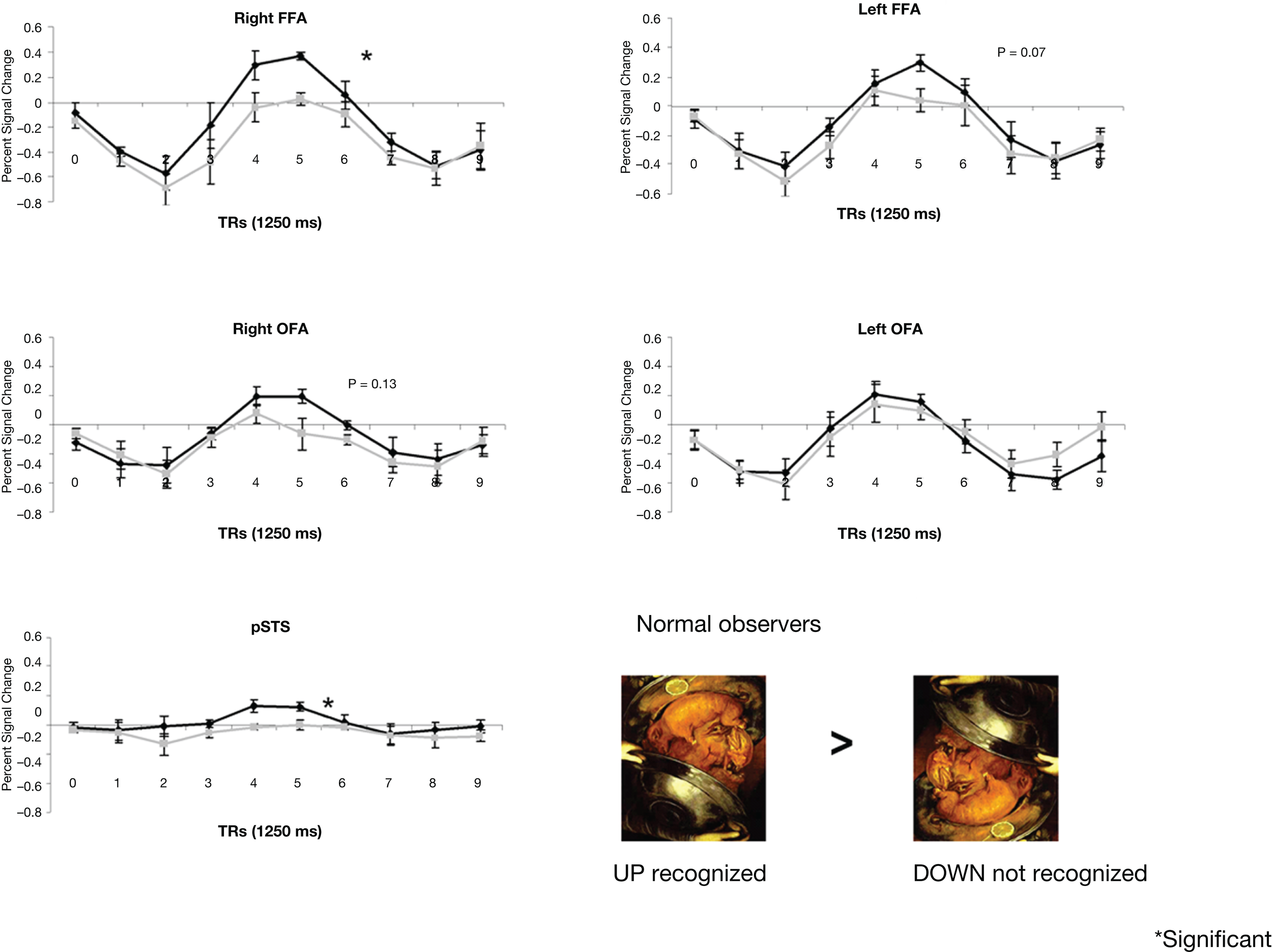 Time-course of activation in face-sensitive regions for the group of normal participants in the Arcimboldo face detection task, for correct trials only. Only the right FFA and the right pSTS showed a significantly larger response to stimuli correctly detected as faces.