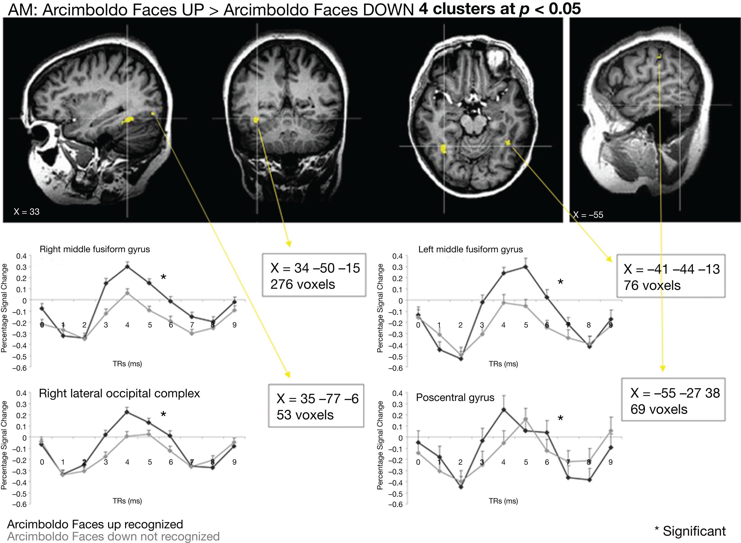 Finally, a whole-brain GLM analysis across control participants was conducted in order to determine, without a priori functional localization, the regions that were primarily involved in the categorization of the stimulus as a face (separately for the Mooney and Arcimboldo experiments). This whole-brain analysis was done also for PS, and for AM.