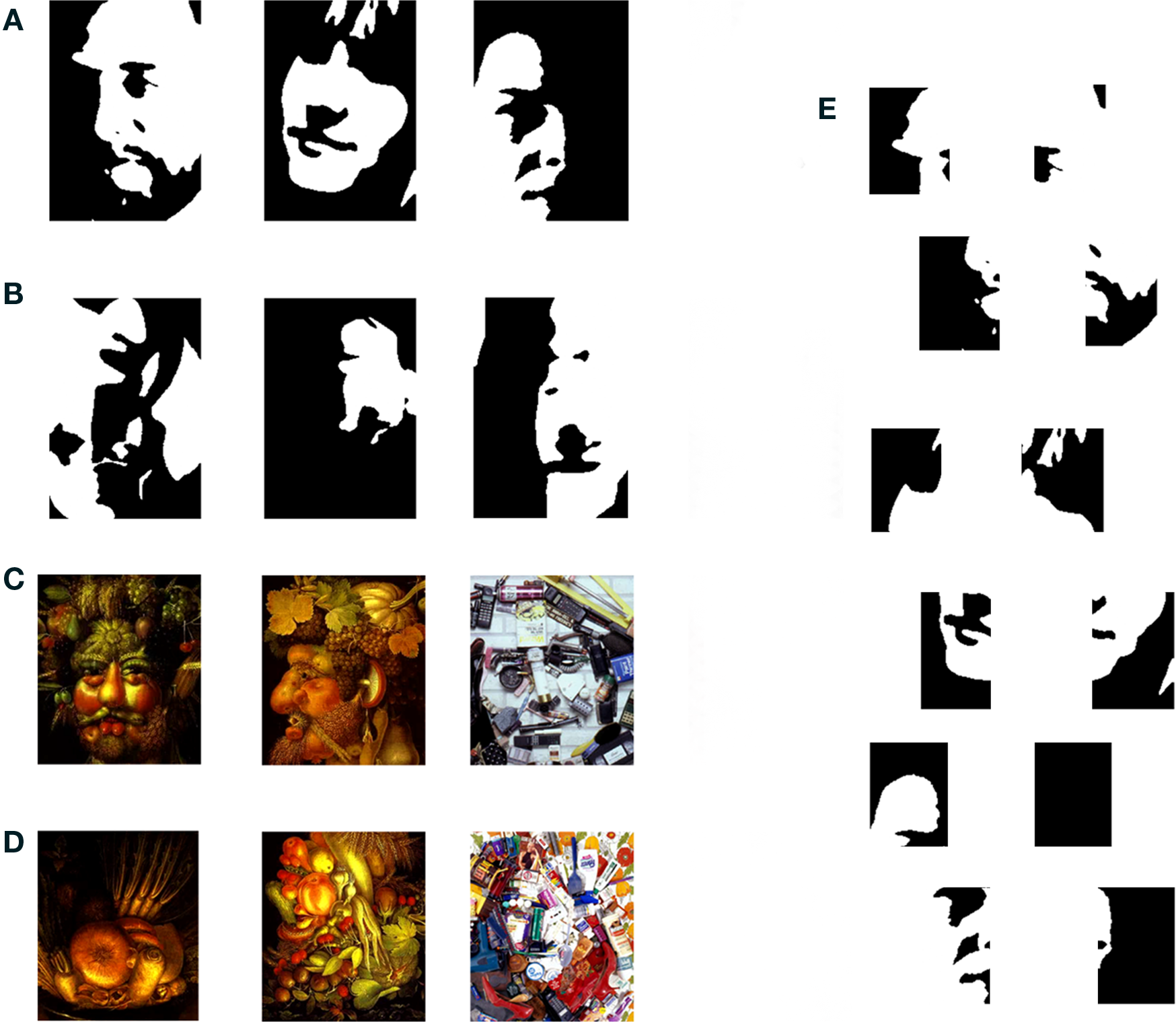 Above. Examples of stimuli used in the experiment 1, Mooney faces (http://www.princeton.edu/artofscience/gallery): (A) Upright stimuli (response = face) and (B) Inverted stimuli (response = non-face). Below. Examples of stimuli used in the experiment 2 Arcimboldo faces (http://www.princeton.edu/artofscience/gallery), (C) Upright stimuli (response = face) and (D) Inverted stimuli (response = non-face). (E) The three Mooney face stimuli above have been divided into four square fragments, spatially displaced. Contrary to fragments of a face photograph (e.g., Ullman, 2007), fragments of such two-tone faces cannot be seen as facelike: the stimulus needs to be perceived as a whole to see the face.