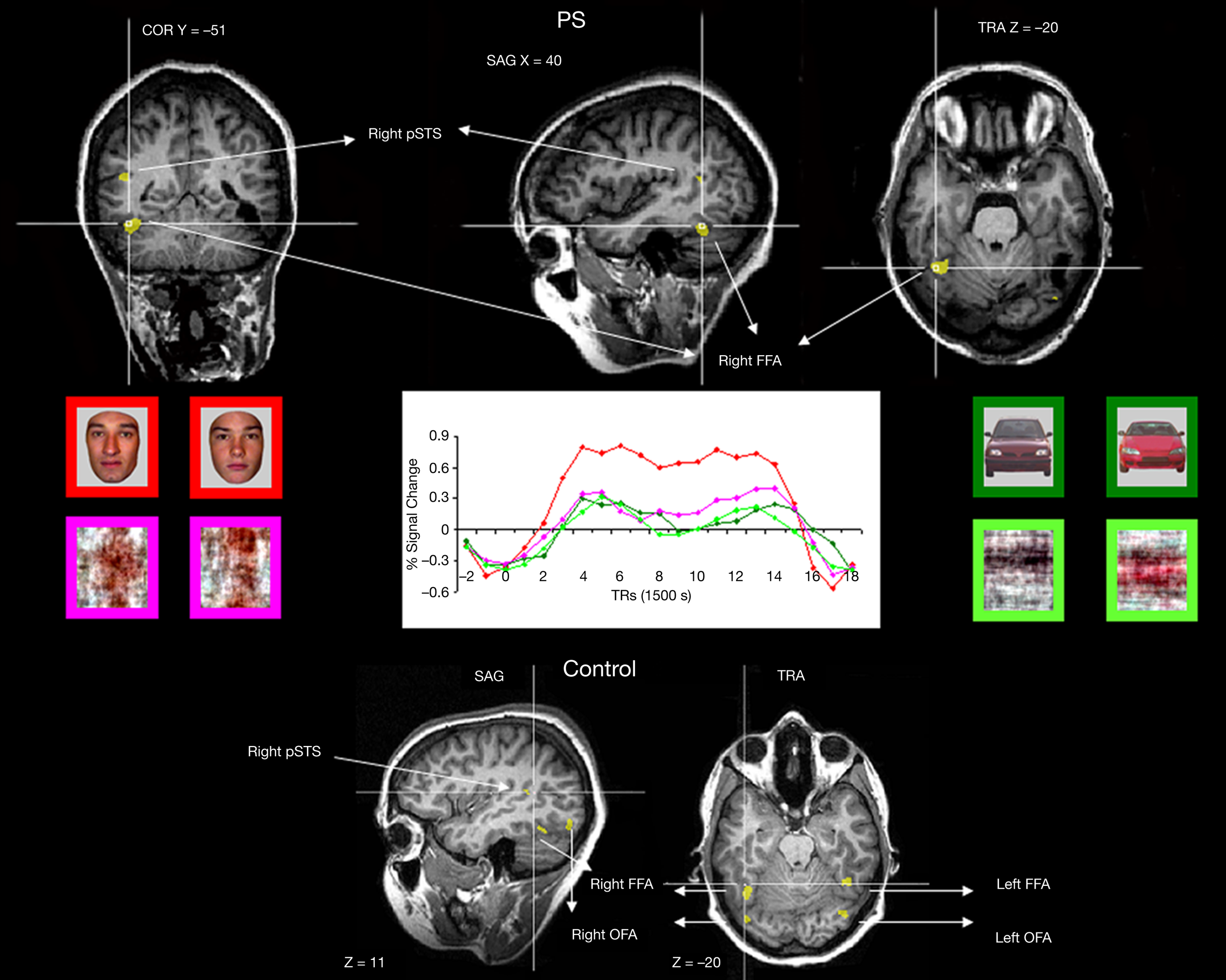 Magnetic resonance images of brain activity were collected from PS and normal controls using a 3T head scanner (Siemens Allegra, Siemens AG, Erlangen, Germany), with repeated single-shot echo-planar imaging: echo time (TE) = 50 ms, flip angle (FA) = 90°, matrix size = 64 × 64, field of view (FOV) = 224 mm × 224 mm, slice order descending and interleaved, slice thickness = 3.5 mm. The other scan parameters varied over the different experiments: repetition time (TR) = 2250 ms, 36 slices for the face localizer (or TR = 1500 ms, 24 slices for four control participants); TR = 1250 ms, 20 slices for the event-related Mooneys and Arcimboldo faces experiments (all participants). A three-dimensional (3D) T1-weighted data set encompassing the whole brain was acquired to provide detailed anatomy (1 mm3) thanks to aADNI sequence(TR = 2250 ms, TE = 2.6 ms, FA = 9°, matrix size = 256 × 256, FOV = 256 mm × 256 mm2, 192 slices, slice thickness = 1 mm, no gap, total scan time = 8 min 5 s).