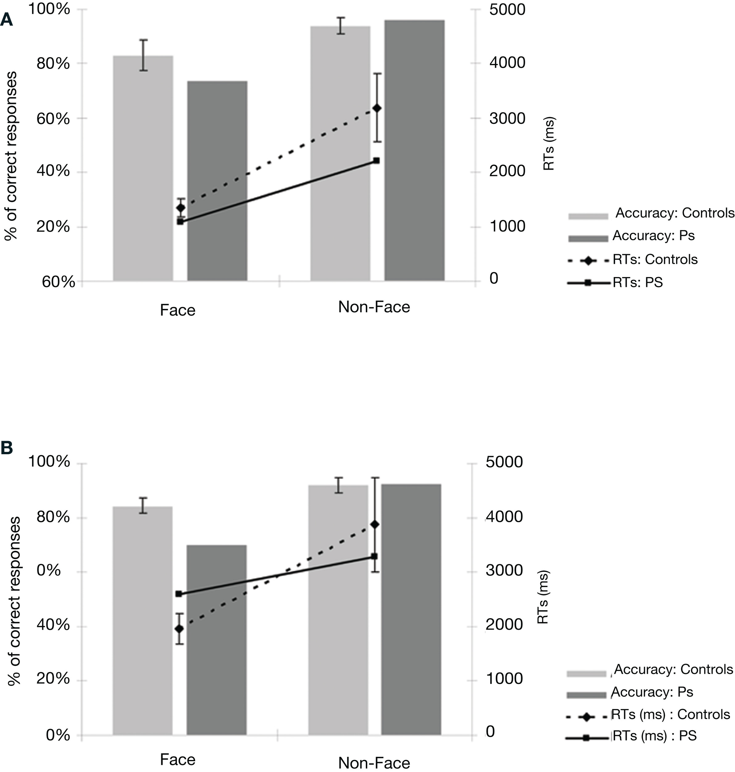 Prosopagnosic patient detected 73.8% of the upright stimuli as faces, a normal range performance (control mean = 83.1%; SD = 17.9; t9 = –0.495; p = 0.316; Crawford and Garthwaite, 2002). She made very few false alarms (3.8%) comparable to the normal controls (6%; SD = 9.4; t9 = 0.223; p = 0.414; Figure 3A). PS was also as fast as the normal controls, independently of the presence of a face in the picture or not (respectively t9 = –0.451; p = 0.331 and t9 = –0.474; p = 0.324; Figure A1A of Appendix).