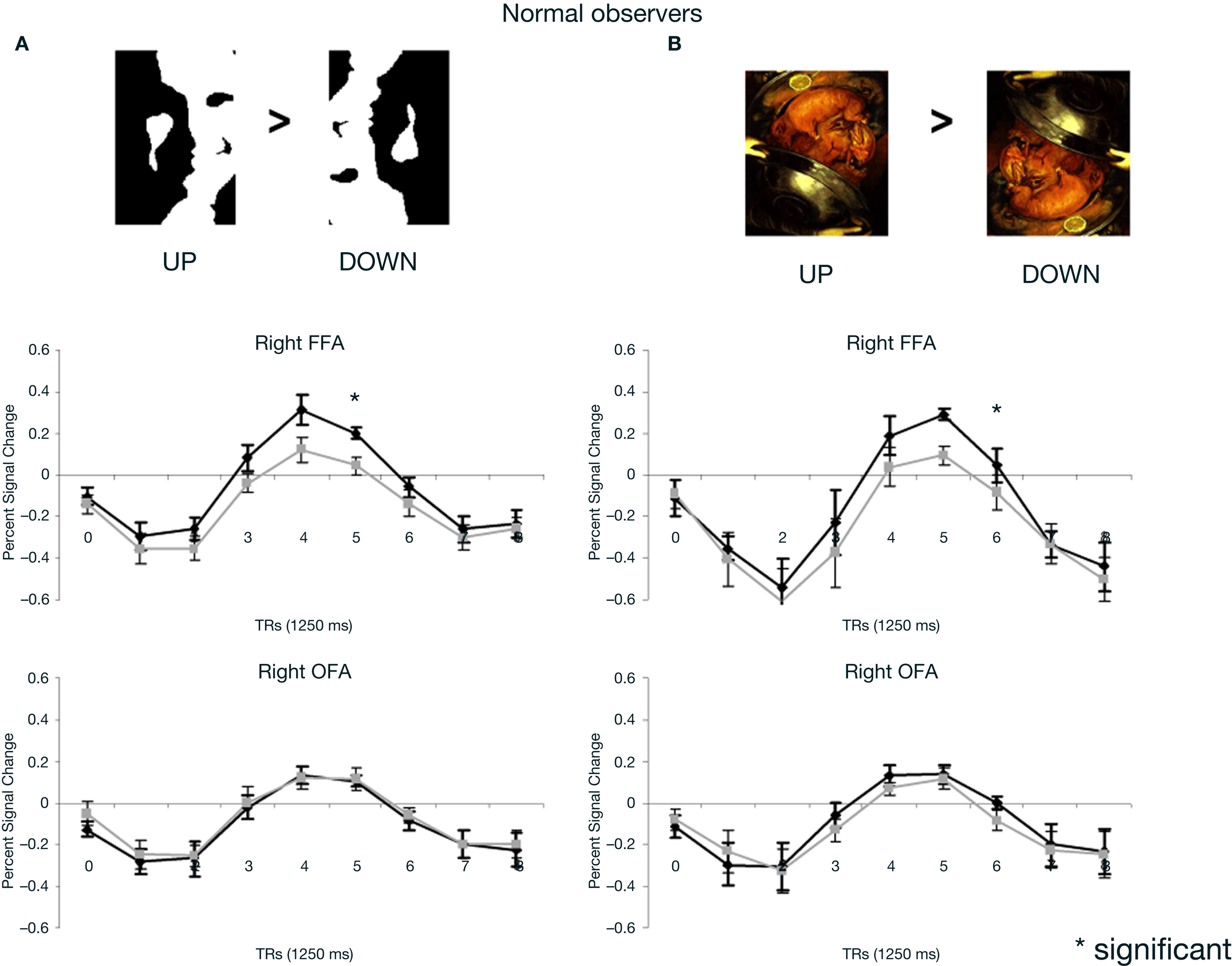 Third, we directly compared PS and the normal participants for the level of activation to Mooney faces in the two face areas showing a significant response for PS: right FFA and pSTS. Average percent signal change for every ROI was computed using the baseline epochs as reference for each condition. An index of the strength of the response in each ROI was computed by means of the beta weights of the GLM analysis as follow: [(upright Mooney faces − inverted Mooney faces) divided by (Mooney faces + Mooney faces inverted]. The exact same index was also computed with comparison of the “correct trials” only (“face” response for upright stimuli; “non-face” response for inverted stimuli). This index was defined in each of the two ROIs, for PS and for every participant. PS’ index in each ROI was then compared to normal participants using the modified t-test of (Crawford and Howell, 1998) as described above. The same contrasts were used for analyzing Experiment 2 with the exception that Arcimboldo stimuli replaced the Mooney stimuli.