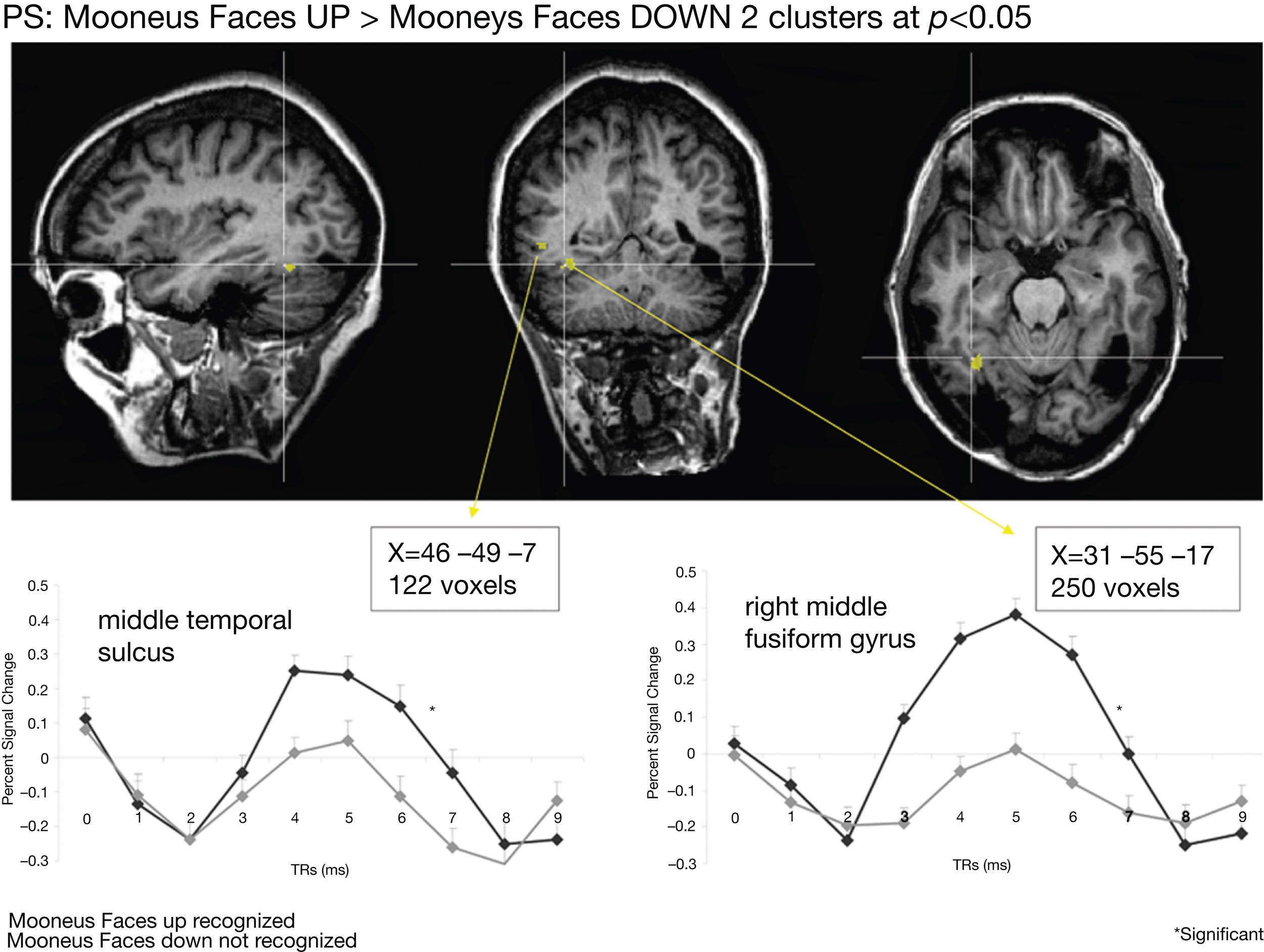 In order to statistically compare PS’ level of activation to these stimuli in face-sensitive areas to the normal population, we calculated an index of activation for upright Mooney faces for each participant (Upright Mooney faces − Inverted Mooney faces/Upright Mooney faces + Inverted Mooney f ces).