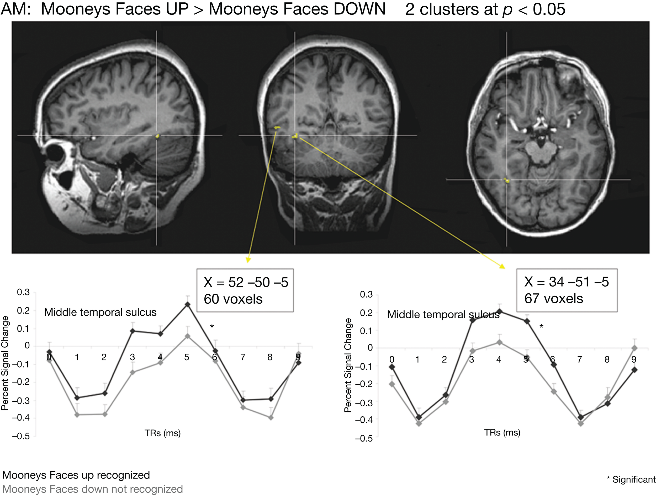 To strengthen our results, a whole-brain analysis was performed on PS’ data with the conjunction of the three contrasts (one per fMRI run: upright Mooney faces–inverted Mooney faces). Two clusters were found at p(uncorrected) < 0.05 in PS’ brain (Figure 7). The first one corresponds roughly to the FFA (31, −55, −17, 250 voxels). It shows a preferential response to faces over cars and scrambled faces in PS's face localizer (F–O: t = 8.34, p < 0.000001, F–SF: t = 8.36, p < 0.000001). The other one was located near the middle temporal sulcus (46, −49, −7, 122 voxels), and does not show a preferential response to faces in the localizer (larger for both objects and scrambled faces than faces: F–O: t = −1.45, p < 0.15 and F–SF: t = −2.11, p = 0.04). The same analysis was performed with AM (Figure 8), for which we also found two clusters: 34, −52, −13 (67 voxels; face-sensitivity: F–O: t = 15.25, p < 0.000001, F–SF: t = 26.31, p < 0.000001) corresponding exactly to her right FFA, and 52 −50 −5 (60 voxels) in the middle temporal sulcus (face-sensitivity: F–O: t = 10.27, p < 0.000001, F–SF: t = 11.35, p < 0.000001; note the proximity with the pSTS).