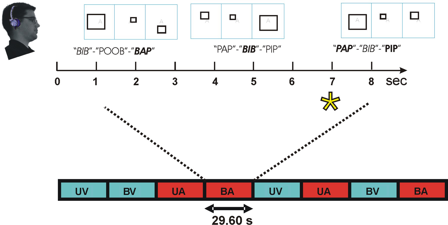 Intermodal selective attention block design. Stimuli were presented in blocks lasting 29.6 s. In speech conditions, subjects discriminated triads of consonant–vowel–consonant (CVC) syllables. Within each block, two consonants (one voiced, one unvoiced) were used that shared place (front, middle, or back) and manner of articulation (plosive or fricative). Consonants were combined with 3 different vowels to create 12 different CVC syllables. Recordings of the 12 CVCs were obtained twice from each of four different talkers to create 96 different tokens that were sampled randomly. Subjects focused attention on the modality cued by a letter at fixation (e.g., “A” = auditory, top) and performed a one-back, triad matching task. During attend-CVC conditions, subjects matched CVC triads regardless of talker. In non-speech conditions, subjects discriminated the frequency-modulation pattern of triads of syllable-length amplitude modulated noise bursts (AMNBs). AMNBs were amplitude modulated at four different frequencies. Different AMNBs were spectrally matched to each of the four talkers. During visual attention conditions subjects discriminated triads of open, closed, or exploded rectangles. On bimodal blocks, auditory and visual stimuli were presented asynchronously to minimize multimodal integration. Attend-auditory (red) and attend-visual (blue) blocks occurred in constrained random order. Block conditions: UV, unimodal visual; UA, unimodal auditory; BV, bimodal, visual attention; BA, bimodal auditory. Enlarged: BA block with front plosives (/p/ and /b/). Talker: female talker 1, female talker 2, male talker 1, male talker 2. Target = asterisk.