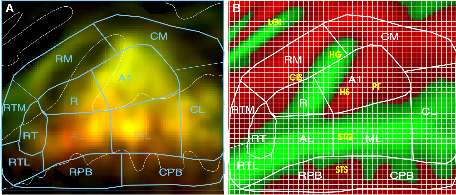 Quantifying activations. (A) Mean percent signal change (0.05–0.58%) of activations coded by brightness. Color shows stimulus preferences (red = CVC, green = AMNB). Yellow areas were activated by both stimulus classes. See text for ACF labels. (B) ACF locations projected on average curvature map of the superior temporal plane (green = gyri, red = sulci), showing anatomical structures and grids used for quantification. Green = gyri, red = sulci. CiS, circular sulcus; HG, Heschl's gyrus; HS, Heschl's sulcus; PT, planum temporale; STG, superior temporal gyrus; STS, superior temporal sulcus, LGI, long gyri of the insula.