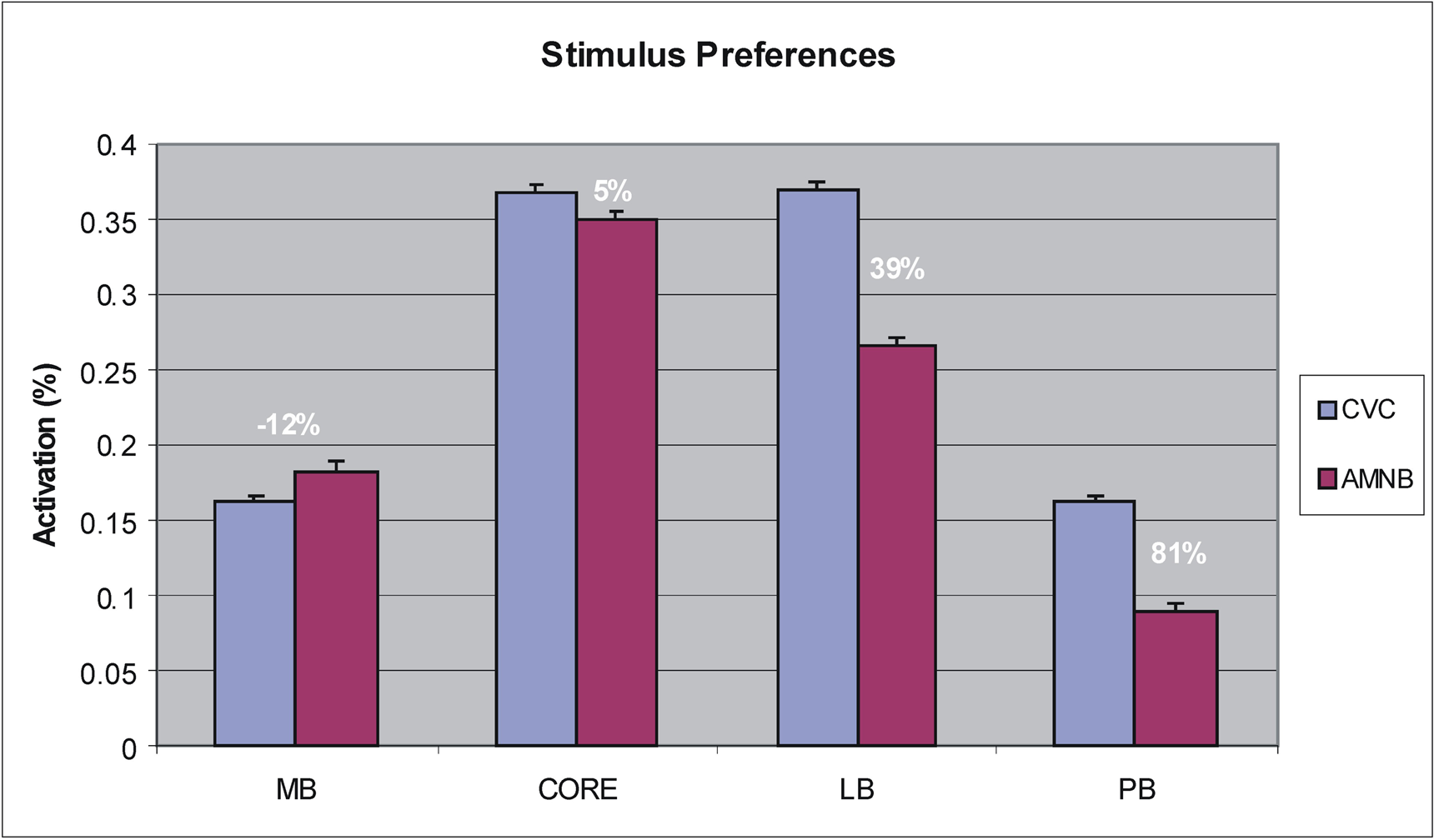 Stimulus preferences of different field groups showing mean activation magnitudes and the percent enhancement within each field group for CVC syllables vs. amplitude modulated speech-spectrum noise bursts (AMNB).