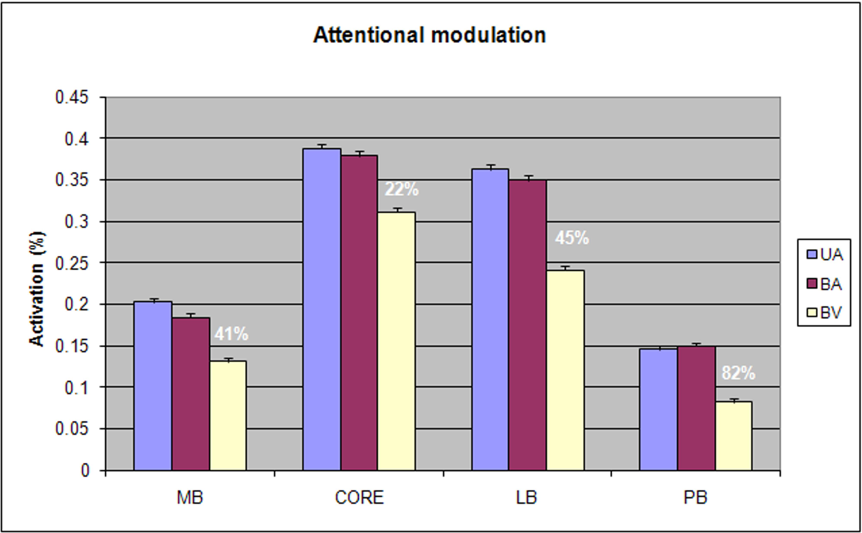 Attentional modulation of different field groups showing activation magnitudes and mean percentage of attentional enhancement for each field group. UA = unimodal auditory, BA = bimodal auditory attention, BV = bimodal visual attention.