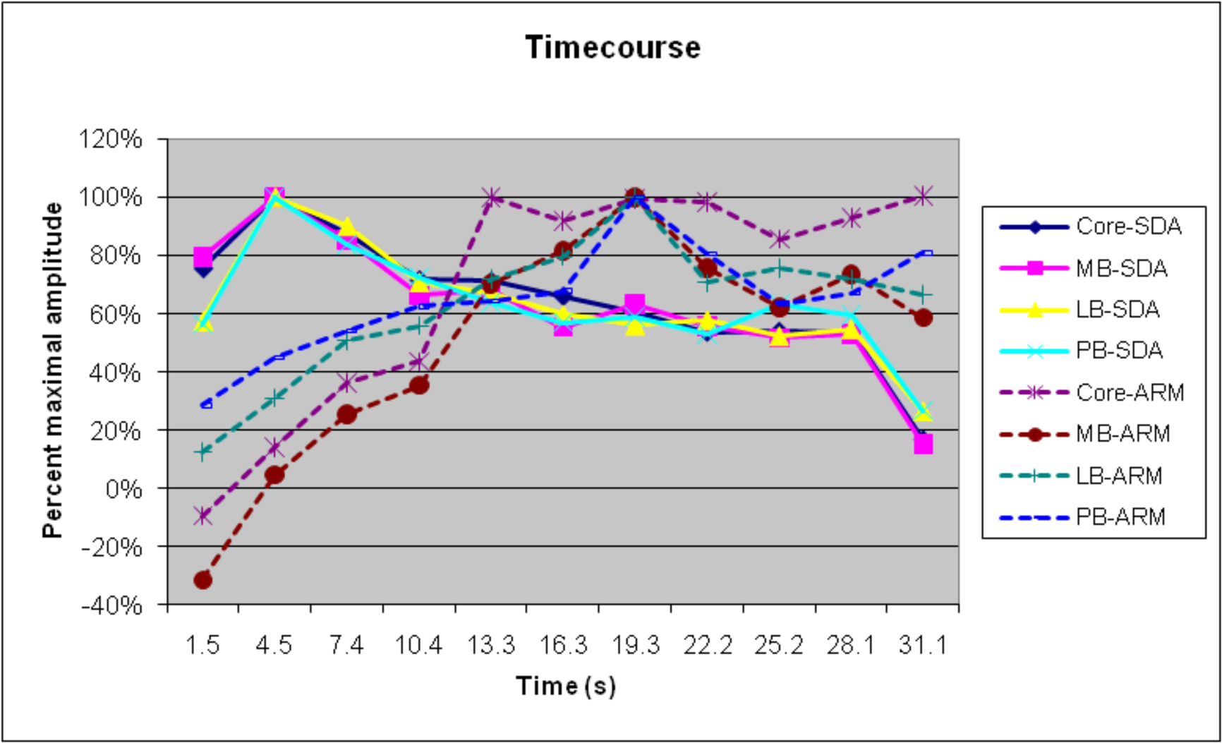 Figure 7 shows the timecourse of SDA and ARMs, for the different field groups. As in previous studies, SDAs peaked shortly after sound onset and showed a gradual adaptation throughout the stimulus block (Petkov et al., 2004). In contrast, ARMs were minimal at block onset but increased in magnitude over the first 21 s of sound delivery, remained at a high level until the end of the stimulation (image 10), and continued during the first image of the next stimulation block. As a consequence, field groups with relatively larger ARMs would be expected to show delays in the timecourse of activations. We did find small but significant differences in the timecourse of amplitude-normalized activations between field groups [F(30,390) = 2.49, p < 0.04], with delays in lateral belt and parabelt fields and increased persistence of activations after sound offset in comparison with activations in the core and medial belt. However, when SDAs alone were analyzed, the differences in time courses of different field groups failed to reach significance [F(30,390) = 1.35].