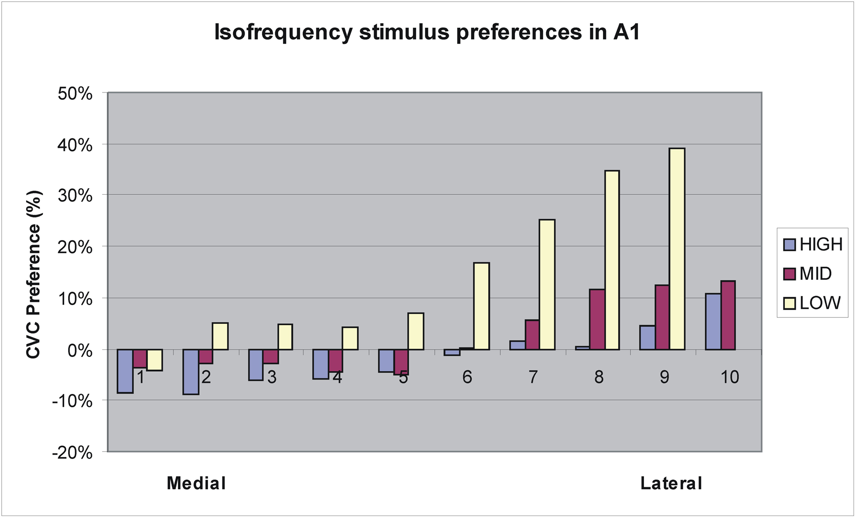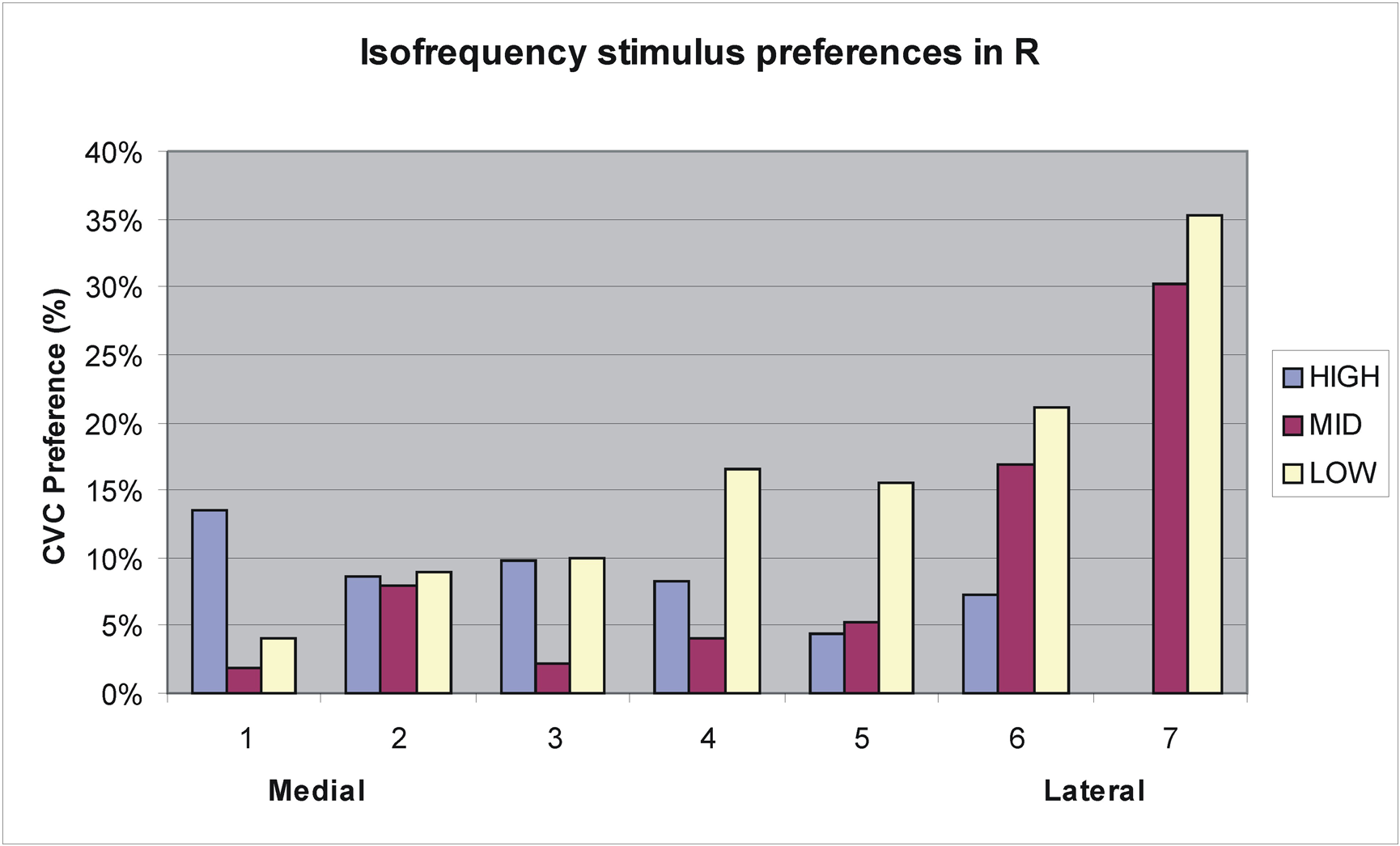Auditory CVC and AMNB activations were quantified using a rectangular grid that contained 1,748 1.75-mm × 1.75-mm grid elements as shown in Figure 4. The grid spanned 80.5 mm anterior–posteriorly and 66.5 mm medial–laterally on the cortical surface and covered approximately 5400 mm2, i.e., roughly the full spatial extent of auditory response produced during visual attention conditions. Response magnitude (mean percent signal change) was quantified for each grid element in each field. To compare stimulus preferences across fields, we examined the ratio of CVC activations to the mean of CVC + AMNB activations. Thus, fields showing a CVC preference produce CVC/mean ratios above 100%, while fields with AMNB preferences produced CVC/mean ratios below 100%. Stimulus preferences were statistically evaluated using ANOVA for repeated measures with subjects treated as a random factor and ACF or ACF-group, Stimulus-type (CVC or AMNB), Hemisphere (left or right), Ear of delivery and Time after block onset (i.e., image number) included as factors. Individual ACFs were also analyzed with grid position as a factor to determine if there were significant differences in the distribution of activations within ACFs as a function of stimulus type or ear of delivery.