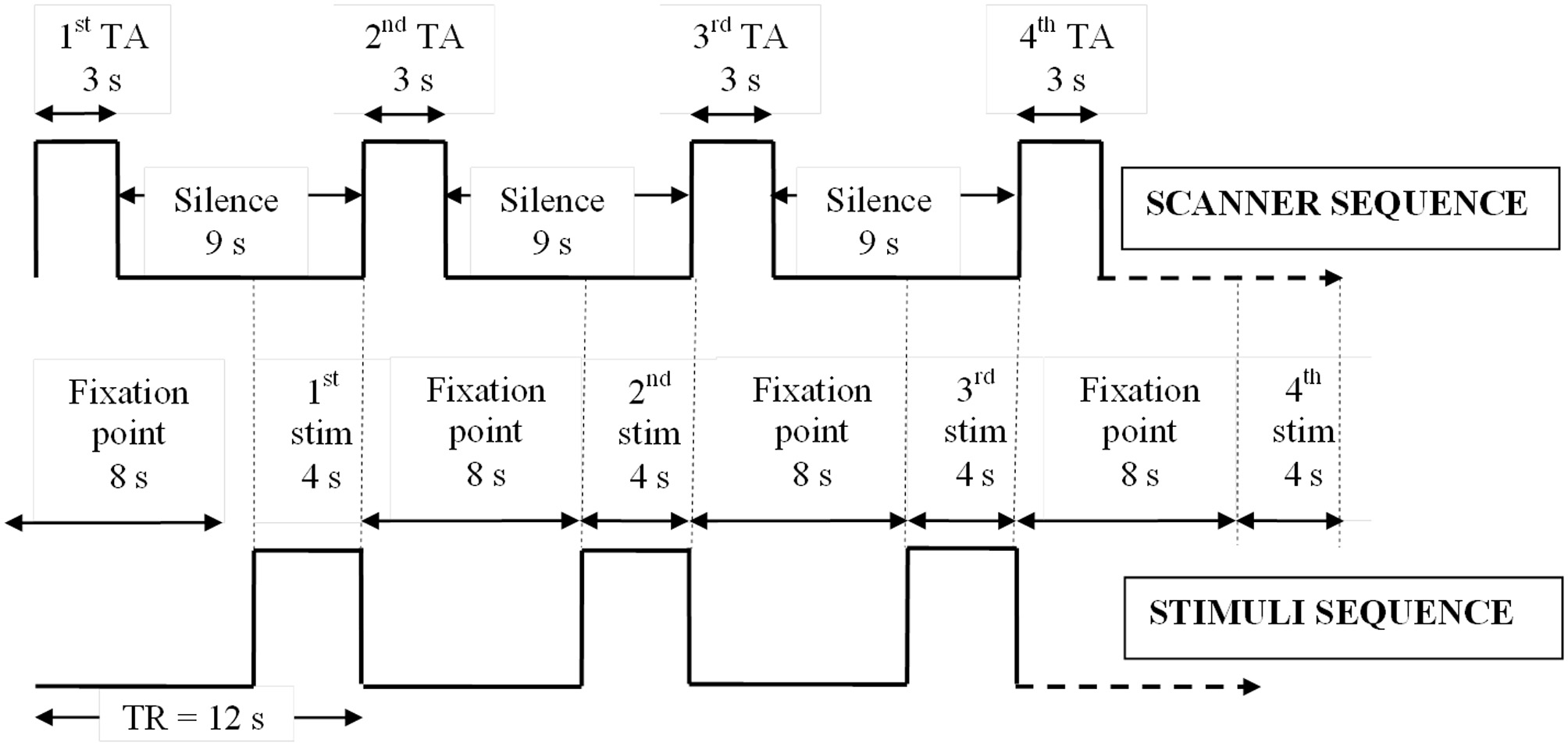 Sparse EPI protocol. Relative timings of stimulus presentations and sparse scanner sequence showing how stimuli were delivered in silence immediately prior to fMRI data collection. TA, acquisition time; TR, repetition time; stim, stimulus; s, seconds.