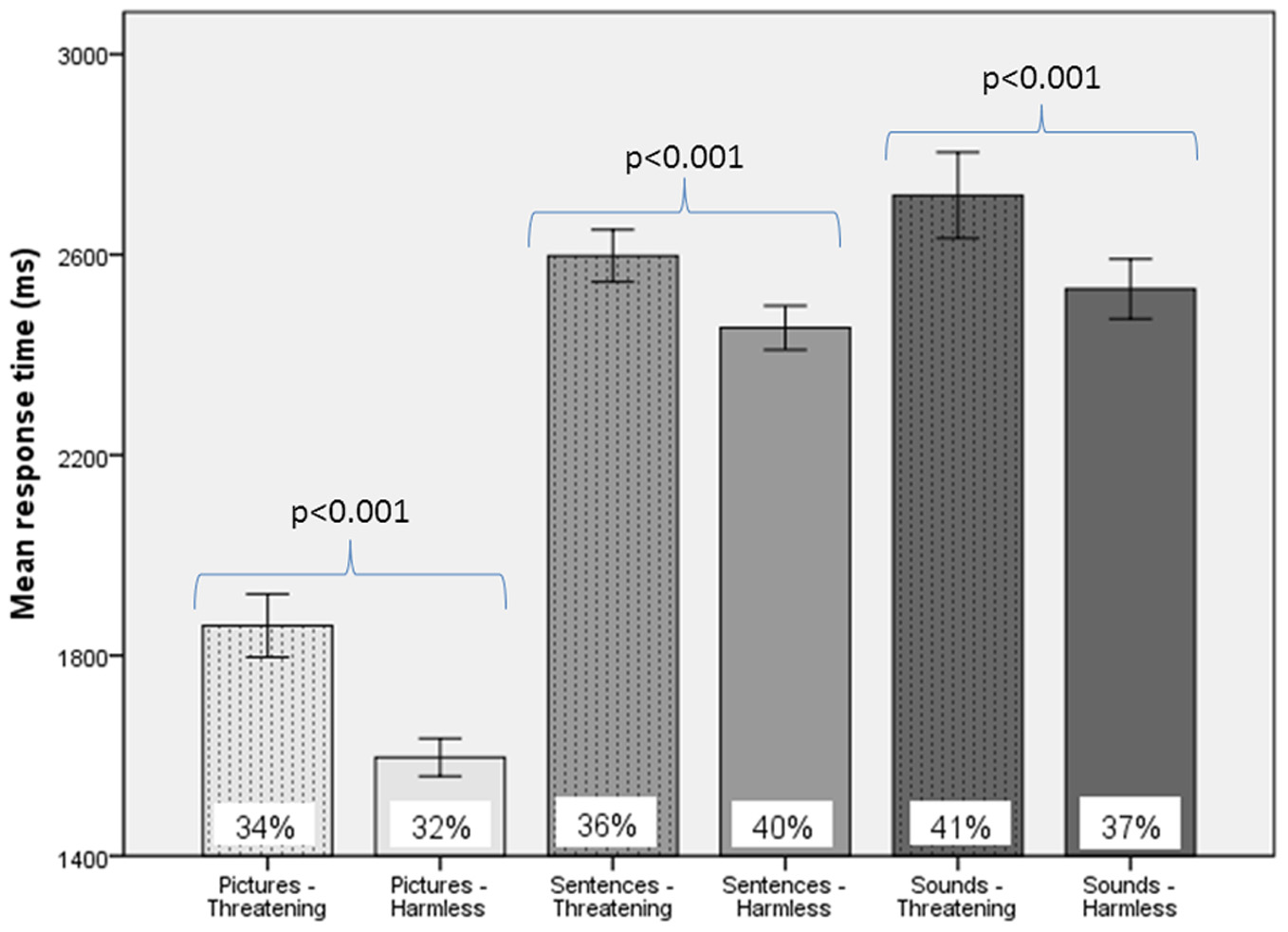 Response times and frequency of evoked SCRs to picture, sentence, and sound stimuli. “Threatening” responses are shown as dotted columns; “harmless” responses are shown as plain columns. Error bars are 95% confidence intervals. There was a main effect of modality on RTs [sounds longer RTs than sentences, which had longer RTs than pictures; F(2, 48) = 98.05, p < 0.001], a main effect of subjective assessment on RTs [“threatening” longer RTs than “harmless”; F(1, 24) = 14.51, p = 0.001], but no main effect of presence or absence of an SCR on RTs [F(1, 24) = 0.26, p = 0.614; data not shown; repeated measures ANOVA]. There were no significant differences in the percentage of SCRs to stimuli assessed as “threatening” compared with those subjectively assessed as “harmless” (% figures in chart bars).