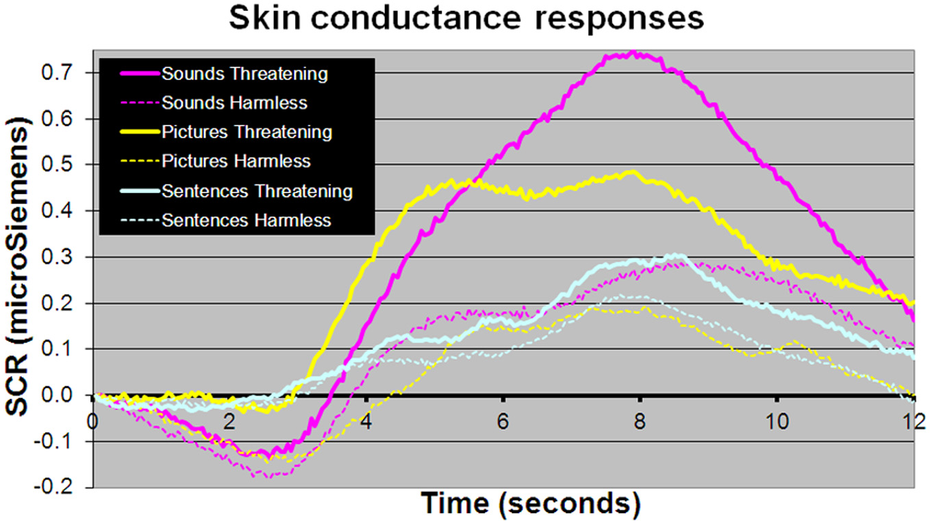 Mean SCR amplitudes to picture, sentence, and sound stimuli. Sound and picture stimuli subjectively assessed as “threatening” (solid lines) compared with those assessed as “harmless” (dotted line) evoked significantly larger SCR amplitudes (t = 2.65, p = 0.006 and t = 1.89, p = 0.033, respectively). There was no significant difference in SCR amplitudes between sentence stimuli subjectively rated as “threatening” or “harmless” (p > 0.1).