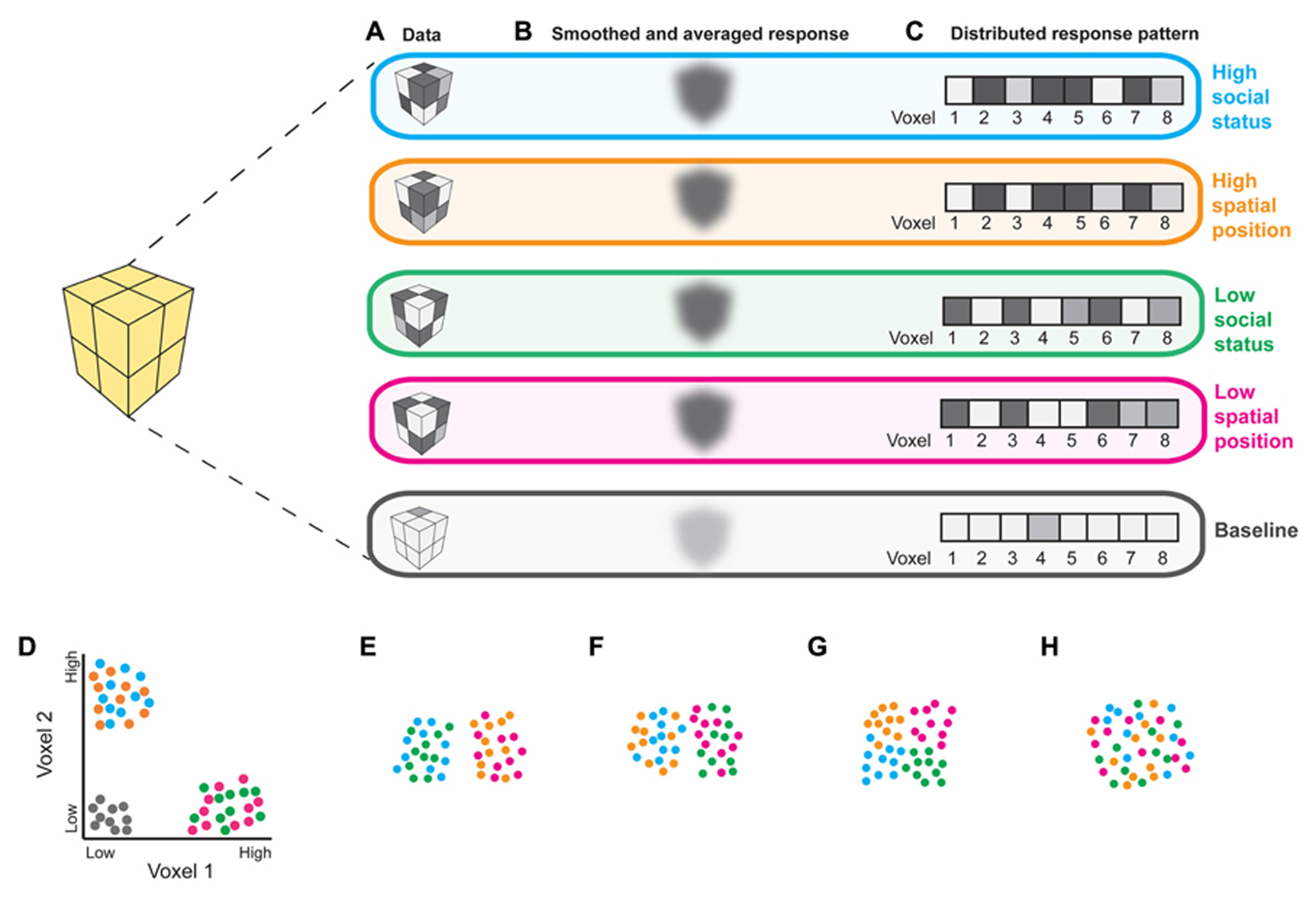 FIGURE 1. Interpreting fMRI responses to social and spatial tasks. (A) Hypothetical responses from an 8-voxel region of interest (ROI) to stimuli depicting: high social status (blue), high spatial position (orange), low social status (green), and low spatial position (pink), as well as baseline (gray; fixation cross). (B) Comparing the magnitude of locally smoothed and averaged responses could reveal that this ROI responds robustly to all 4 conditions relative to baseline, suggesting that it is involved in both social and spatial processing. (C) The same data can be studied as multivoxel patterns; responses from an ROI containing n voxels can be analyzed as n-dimensional vectors. Examining response patterns using MVPA can reveal more detailed information regarding the representational content of an ROI, as illustrated in (D–H). (D) Responses from voxels 1 and 2 from the patterns depicted in (C) for 10 examples of each stimulus category; two-dimensional patterns are presented for clarity of visualization. Each dot represents a response to an example of each experimental condition. Experimental conditions are indicated by dot color. Machine learning algorithms can be used to determine which distinctions a region contains information about (Norman et al., 2006). Here, a linear classifier would accurately distinguish the 4 experimental conditions from baseline, as well as “high” social status and spatial position from “low” social status and spatial position, as would be expected from a brain region that represents social status analogously to spatial position. (E–H) Visualizations of possible representational similarity structures (Kriegeskorte et al., 2008) for responses that may not differ in average magnitude, as in (B). Pairwise correlation distances between response patterns can be used to characterize pattern dissimilarity. Shorter distances between dots indicate greater pattern similarity; larger distances indicate greater pattern dissimilarity. Local response patterns within a region that is recruited for all 4 experimental conditions can contain information about domain (i.e., social vs. spatial) regardless of position (i.e., high vs. low spatial location or social status; E), position but not domain (F), or about both domain and position (G). Alternatively, such a region may not contain information useful in distinguishing either position or domain (H). Thus, MVPA will be useful in testing whether overlapping fMRI activations for social and spatial tasks reflect shared or distinct processing mechanisms.