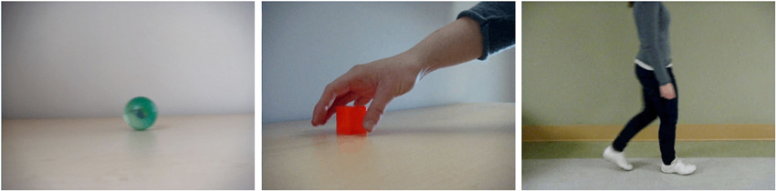 Figure 1. Screenshot examples for the three different conditions (from left to right object movement, reaching for an object, walking).