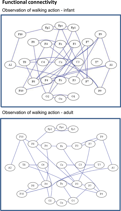 Our study was limited by the difficulty in recruiting infants that were able to attend to the stimuli during EEG data collection without moving. Recruitment challenges required us to collect data on a wider age range of infants than would be ideal. This limitation may have reduced the power of statistical significance in functional connectivity differences due to the variability in motor experiences within the infant group (i.e., the older infants likely have more motor experience with reaching than the younger infants). In addition, although none of the infants had experience in walking independently, older infants may have started cruising or taking a few independent steps. We did not collect detailed information on whether the infants had begun to take a few independent steps and it is possible that this variability may have also led to some minor differences in functional connectivity. However, this is unlikely as our previously published data (Virji-Babul et al., 2012) clearly showed differences in the magnitude of mu desynchronization as well as the onset of this activity in relation to the three conditions. The onset of mu activity was slowest for the walking condition and in addition there were significant differences in the time frequency distributions for the walking condition. Based on these previously published data, we feel that the current analysis provides further evidence that observation of walking is in fact, processed differently from both object and reaching motions. A larger sample would allow comparisons between groups with similar motor experiences and provide more insights into the effect of experience on motor perception. Another limitation of our study is the lack of an action execution condition. A direct comparison of action execution with action observation using a graph theory approach would help differentiate the perception-action coupling networks with the action execution networks and would significantly advance our understanding of the fundamental mechanisms underlying the development of the perceptual motor system.