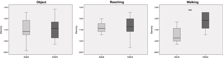Figure 3. Boxplots showing differences between infants and adults in mean values of density for the three conditions (from left to right: object, reaching, walking). ** p < 0.01. Whiskers are representing minimum and maximum points of the data.
