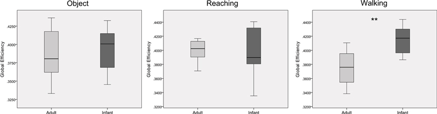 Figure 4. Boxplots showing differences between infants and adults in mean values of global efficiency for the three conditions (from left to right: object, reaching, walking). ** p < 0.01. Whiskers are representing minimum and maximum points of the data.