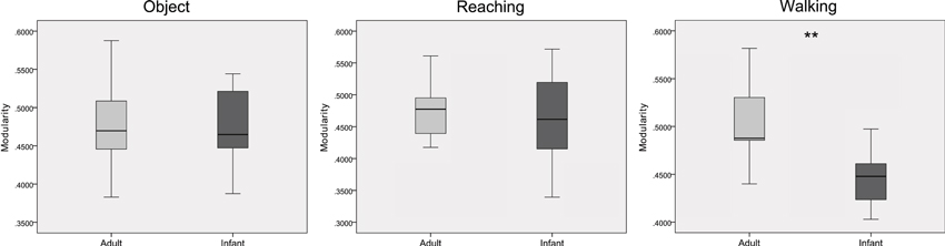 Figure 5. Boxplots showing differences between infants and adults in mean values of modularity for the three conditions (from left to right: object, reaching, walking). ** p < 0.01. Whiskers are representing minimum and maximum points of the data.