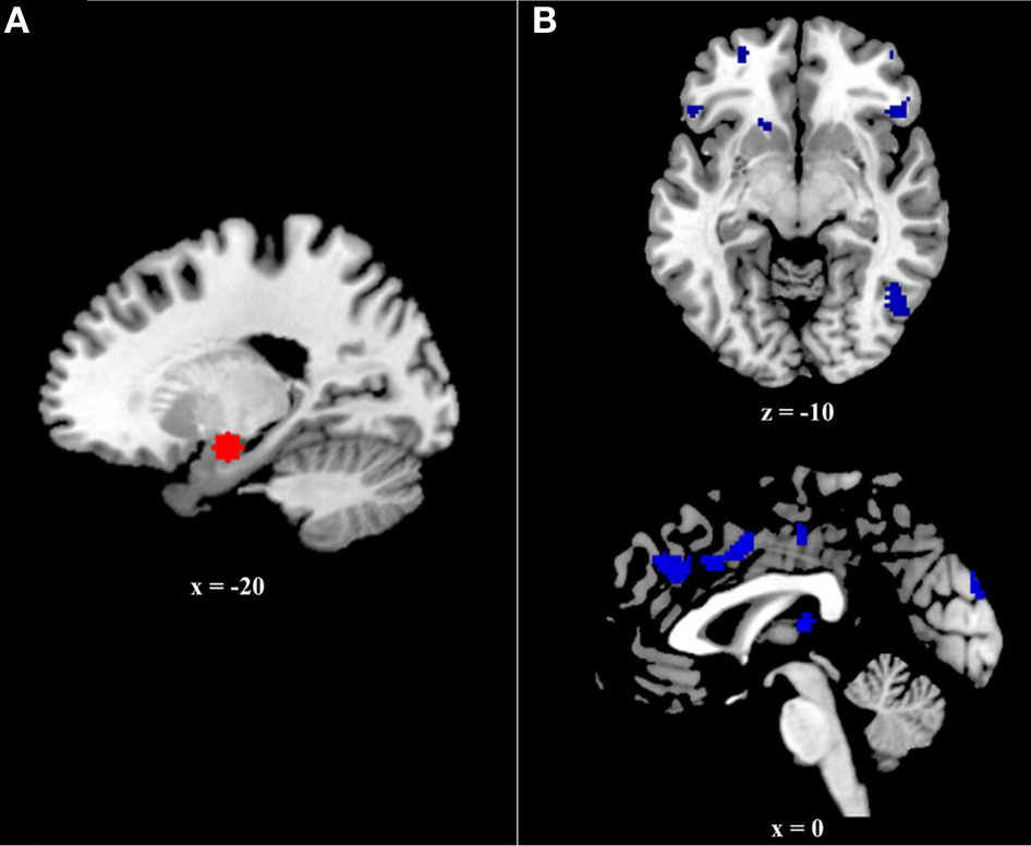 (A) Six millimeter sphere used as the volume of interest (VOI) for psychophysiological analysis. The center of this VOI (−20, −8, −16) was selected via an omnibus contrast that identified regions associated with retrieval (Hits > Correct Rejections) of all events (positive, negative, and neutral), controlling for age. VOIs were created and defined functionally at the single-subject level. (B) Regions exhibiting greater age effects on the relation between functional and structural connectivity during positive event retrieval relative to negative event retrieval.