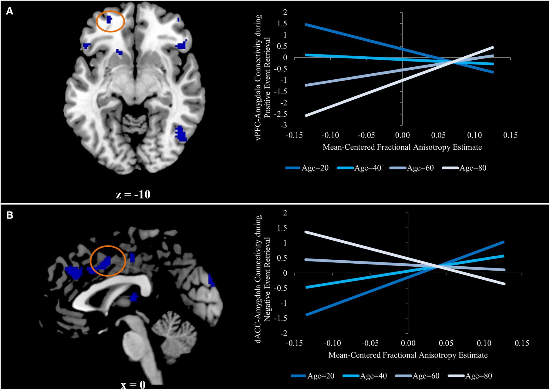 To understand the directionality of these effects, beta estimates of functional connectivity with the left amygdala were extracted from selected prefrontal regions of interest (ROIs) using the REX toolbox (downloaded from http://web.mit.edu/swg/software.htm) and these values were entered into a regression analysis with mean-centered age, mean-centered uncinate FA, and the interactive effect of age and uncinate FA, as predictors. Because mean-centering our age variable examines the effect of FA at age 47, it can only provide information regarding the effects of FA in middle-aged adults. Therefore, although the regression analysis is able to identify interactions, it cannot explain the reason for the interaction. To further interrogate significant interactions, additional models were created with each decade as the zero-point, providing a more complete representation of the interaction. These models were statistically identical to the mean-centered regression, aside from a different regression coefficient for the effect of FA on functional connectivity. This coefficient was used for visualization purposes to better understand the age by FA interaction. In addition, this approach allows for an approximate estimation of when along the lifespan the effect of FA becomes significant.