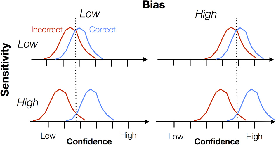 Figure 1. Schematic showing the theoretical dissociation between metacognitive sensitivity and bias. Each graph shows a hypothetical probability density of confidence ratings for correct and incorrect trials, with confidence increasing from left to right along each x-axis. Metacognitive sensitivity is the separation between the distributions—the extent to which confidence discriminates between correct and incorrect trials. Metacognitive bias is the overall level of confidence expressed, independent of whether the trial is correct or incorrect. Note that this is a cartoon schematic and we do not mean to imply any parametric form for these “Type 2” signal detection theoretic distributions. Indeed, as shown by Galvin et al. (2003), these distributions are unlikely to be Gaussian.
