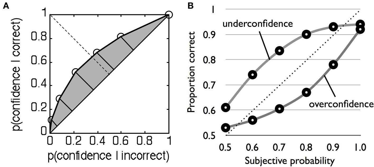 Figure 2. (A) Example type 2 ROC function for a single subject. Each point plots the type 2 false alarm rate on the x-axis against the type 2 hit rate on the y-axis for a given confidence criterion. The shaded area under the curve indexes metacognitive sensitivity. (B) Example underconfident and overconfident probability calibration curves, modified after Harvey (1997).