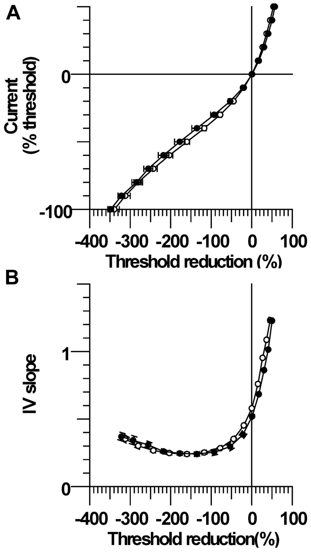 The current–threshold relationship is a threshold analog of the current–voltage relationship (I/V), and quantifies the rectifying properties of the internode. This relationship was determined by recording the threshold for the target CMAP at the end of 200 ms subthreshold polarizing currents of different strengths. The strength of the polarizing current was adjusted in 10% steps from +50% of control threshold (depolarizing) to -100% of control threshold (hyperpolarizing). The criteria for a valid threshold estimate was the same as that used during recording of threshold electrotonus.