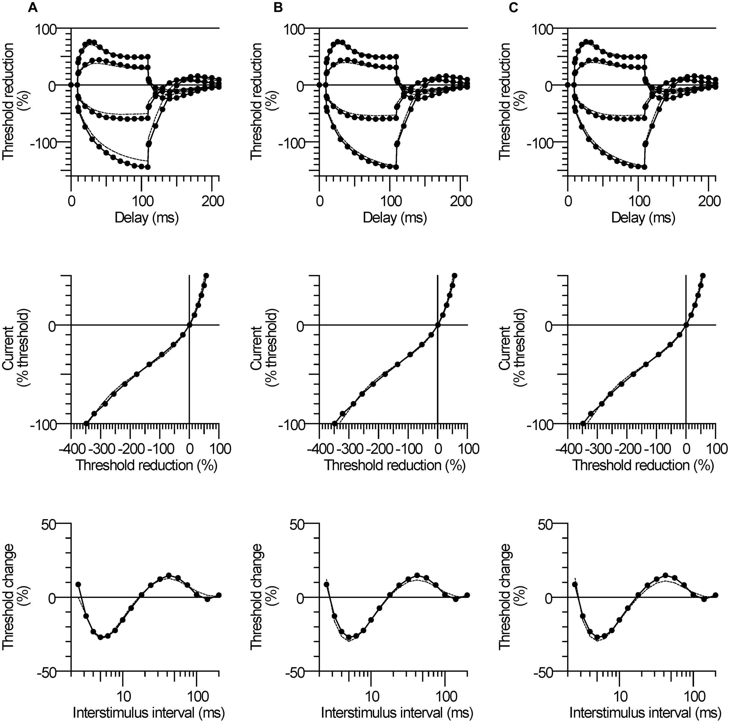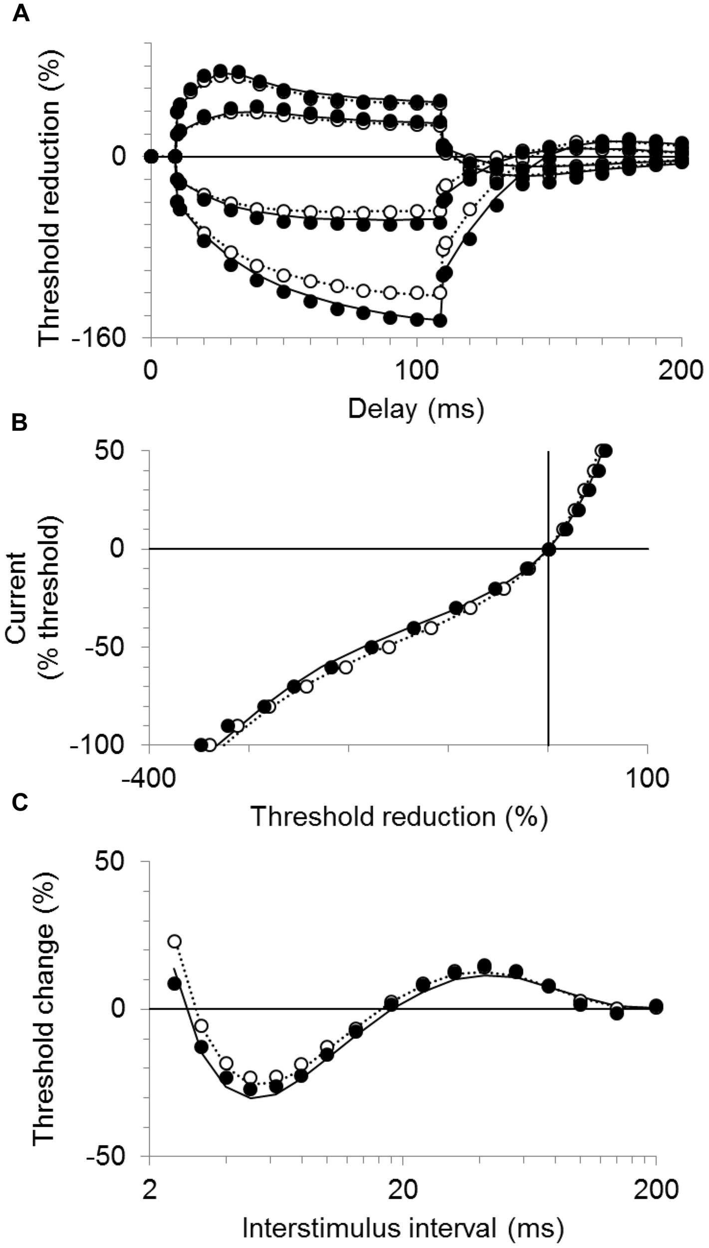 Prolonged (100 ms) subthreshold polarizing currents were used to alter the nodal and internodal membrane potential, a process referred to as electrotonus. The term “threshold electrotonus” refers to the fact that changes in threshold usually parallel the underlying electrotonic changes in membrane potential (Bostock and Baker, 1988). Five stimulus combinations were tested in turn; test (control) stimulus alone, test stimulus plus 100 ms polarizing conditioning current set to ±40% of the control threshold current; test stimulus plus 100 ms polarizing conditioning set to ±20%. Each stimulus combination was repeated until three valid threshold estimates were recorded. A valid threshold was defined as the CMAP being within 15% of the target response, or alternate responses being above or below the target (Kiernan et al., 2000).
