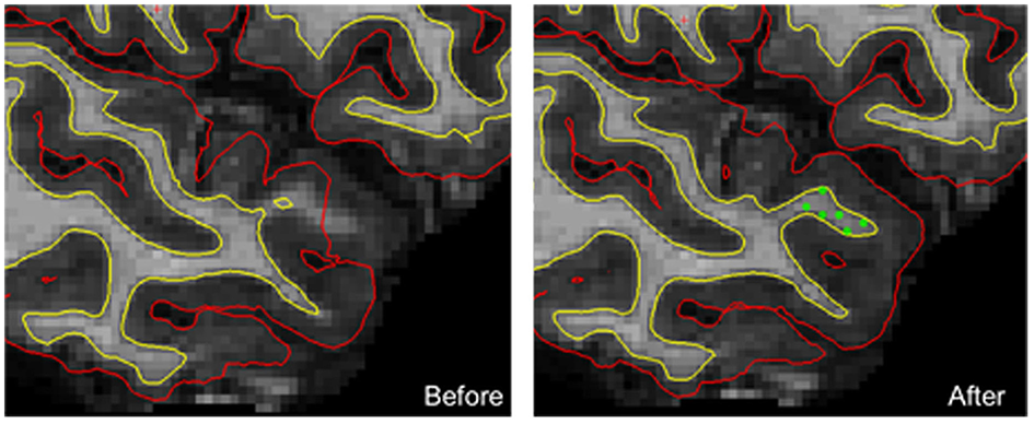 An example of manual corrections applied in case of wrong estimation of pial and/or white cortical surfaces. In this individual, the FreeSurfer software did not correctly estimate both white and pial surfaces in the upper part of the temporal pole. Manually adding checkpoints to the white matter surface results in better surface estimation after a second extraction process (yellow line, white surface; red line, pial surface; green dots, checkpoints).
