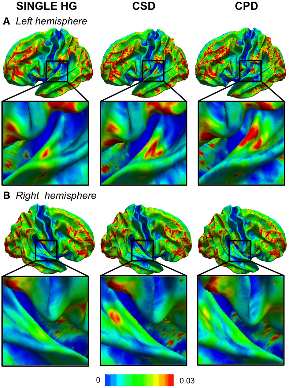 Variability maps of the curvature (CURV) parameter in the left (A) and right (B) hemispheres. The color scale represents the variance of the CURV parameters computed for each HG gyrification pattern in each hemisphere. The zoomed part is centered in the temporal transverse region where the HG duplication is located.