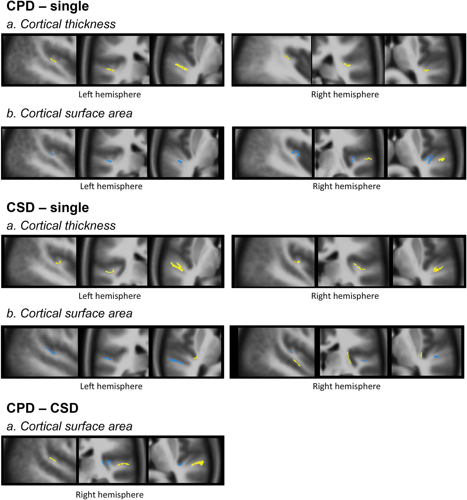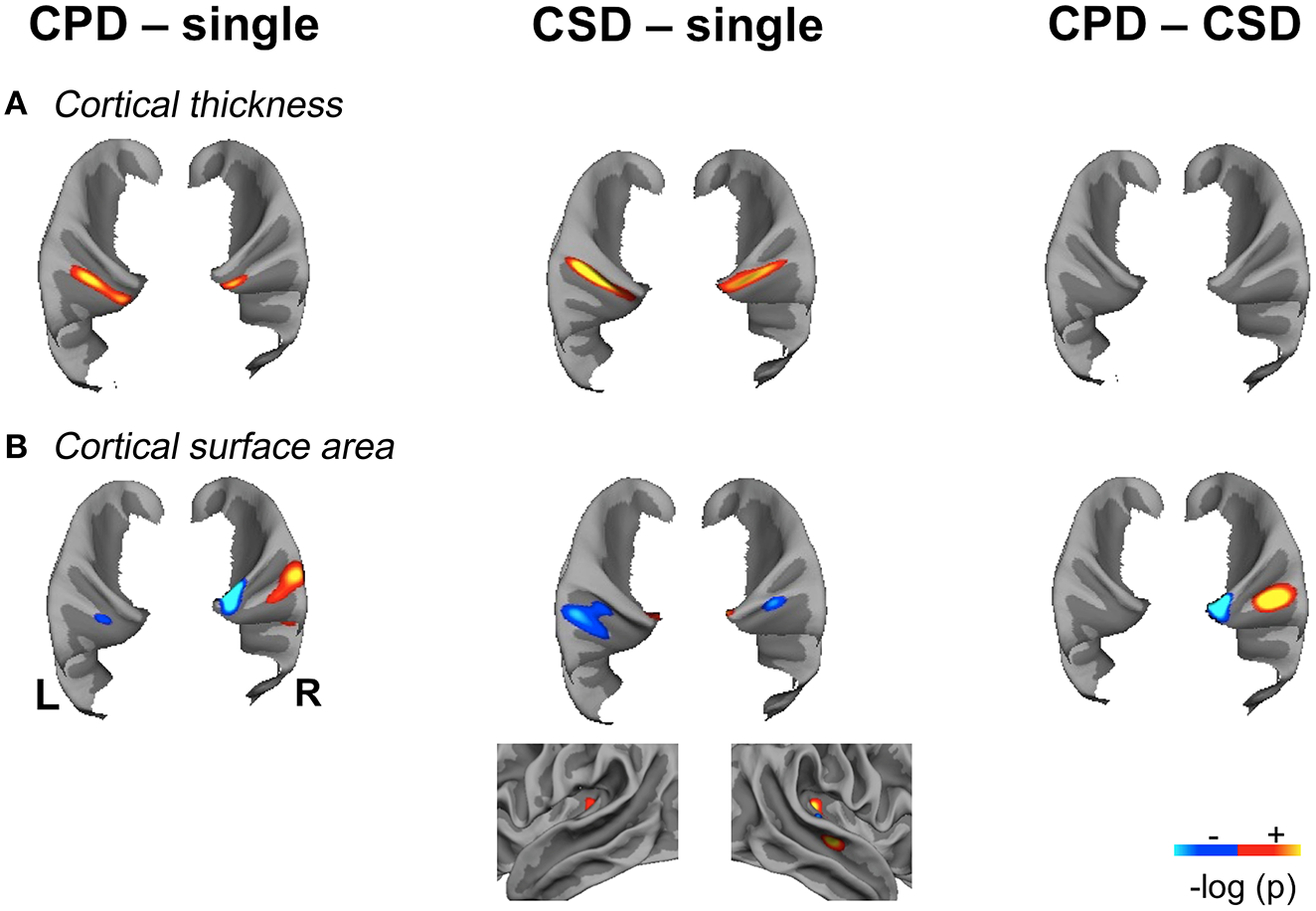 Local variations of Cortical Surface Area (CSA) detected in “CPD–single HG”, “CSD–single HG,” and “CPD–CSD” contrasts.