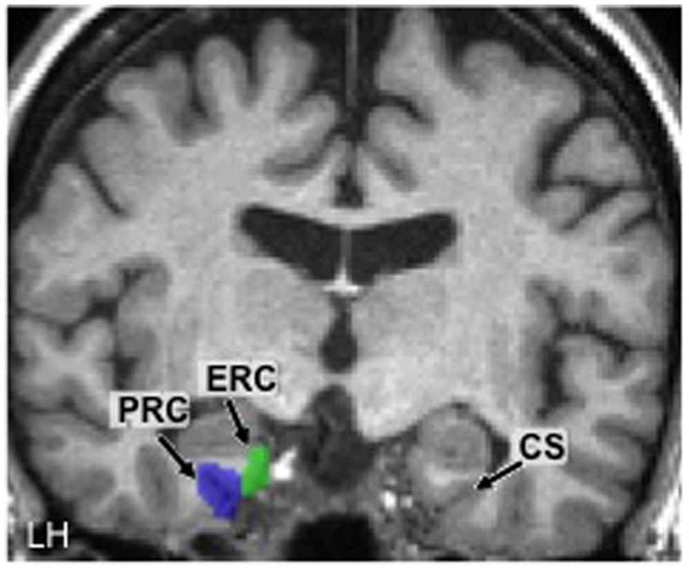 Hand-drawn medial temporal lobe regions of interest (ROIs) in the left hemisphere (LH) in one participant. The collateral sulcus (CS) is shown in the other hemisphere as a point of reference. PRC, perirhinal cortex; ERC, entorhinal cortex.
