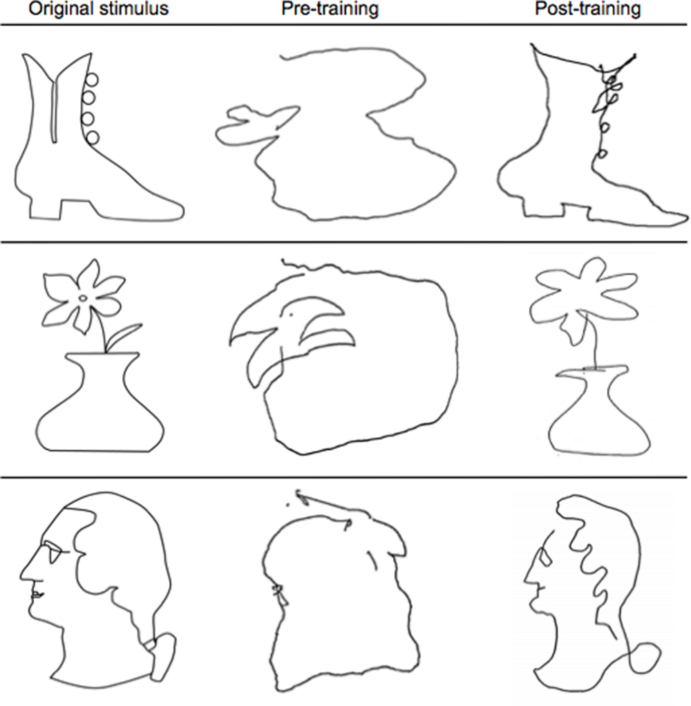 Representative examples of pre- and post-training drawings. Note the substantial improvement from pre-training (middle column) to post-training (last column) in resembling the original stimulus (first column) after just 5 days of the Cognitive-Kinesthetic training.