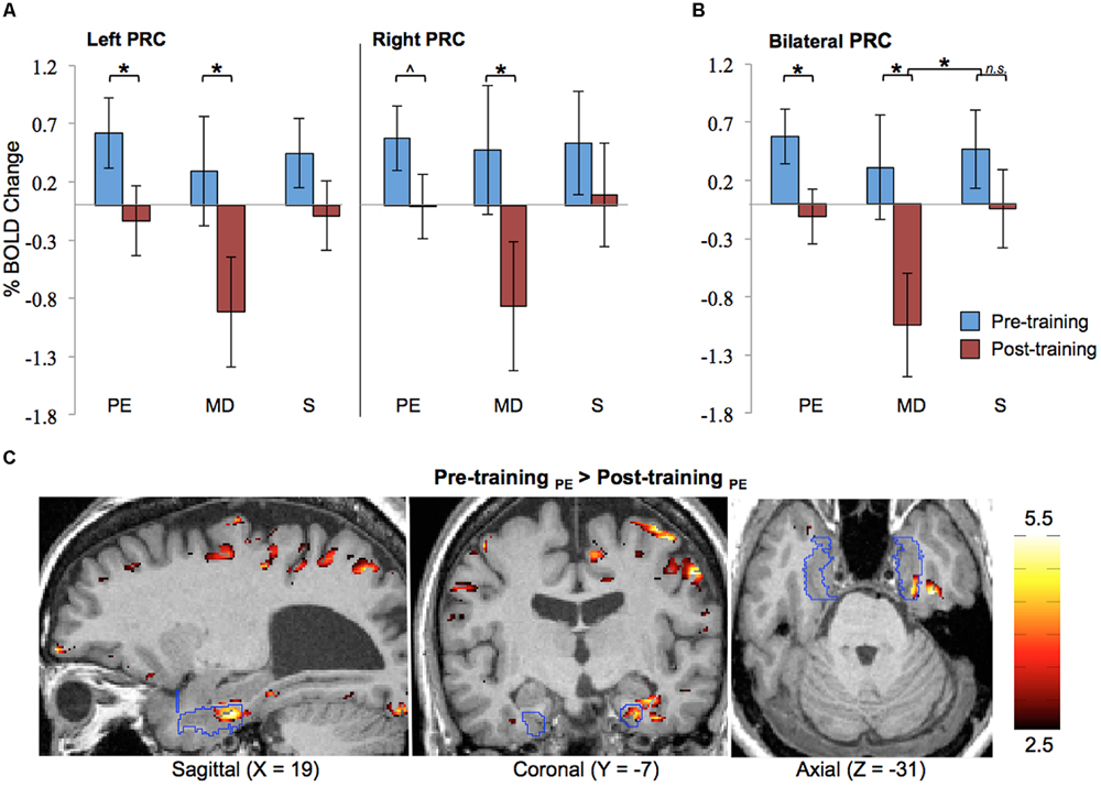 As expected, no significant differences in activation between pre- and post-training were observed during the control task (S) in either the left or right PRC.