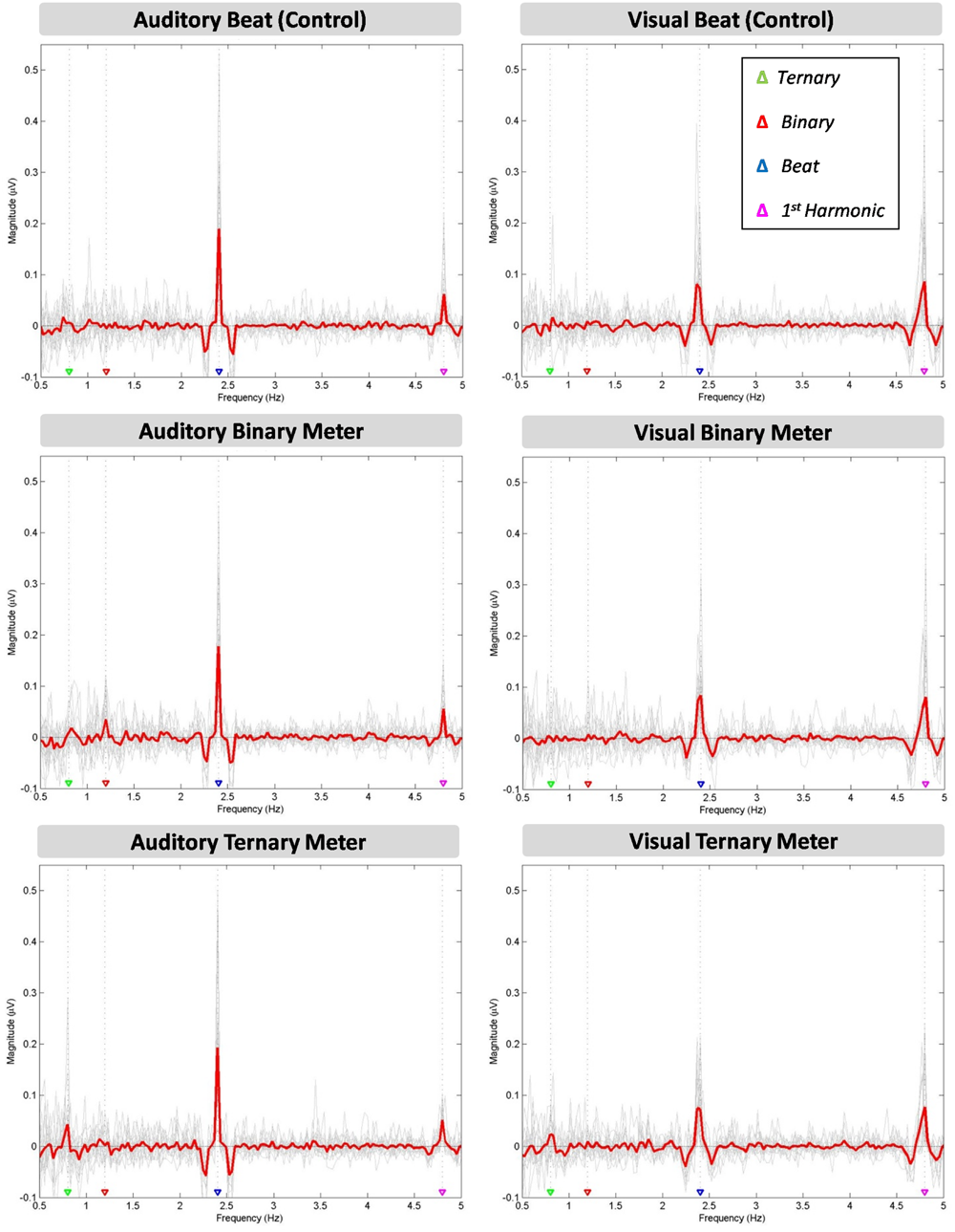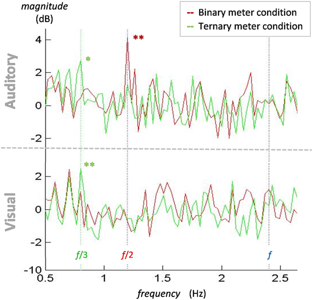 These results might be due to a similar top–down meter effect for both modalities in the ternary-meter condition enhancing the ternary subharmonic of the beat (f/3), the downbeat of the ternary meter. Unfortunately, this enhancement was not consistently found for the binary subharmonic (f/2) because the averaged values of both auditory and visual binary-meter conditions at 1.2 Hz might not be significantly greater than those of other conditions. In fact, the interaction reported by the second ANOVA (comparing each top-of-the-peak value) at 1.2 Hz points to the absence of the binary-meter effect in one modality. Furthermore, both binary and ternary metrical effects could also be affected by the variability across participants in projecting meter or in unconsciously grouping the beat during the control condition, despite our instructions. In order to control for inter-individual variability (see the gray lines of Figure 2), we explored our data using a different signal-to-noise method, namely using each individual’s beat condition as a baseline in order to obtain a relative measure that takes that person’s variability into account.