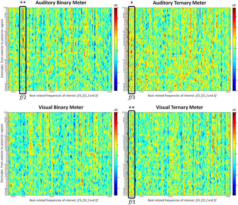 The power spectra for each modality and condition were obtained by taking the modulus squared of the amplitudes resulting from the FFT. Here, we used the control (beat) condition as a baseline to normalize and convert the amplitudes from the metrical conditions (binary, ternary) into decibels. This procedure consisted of applying the following operation: 10 log10