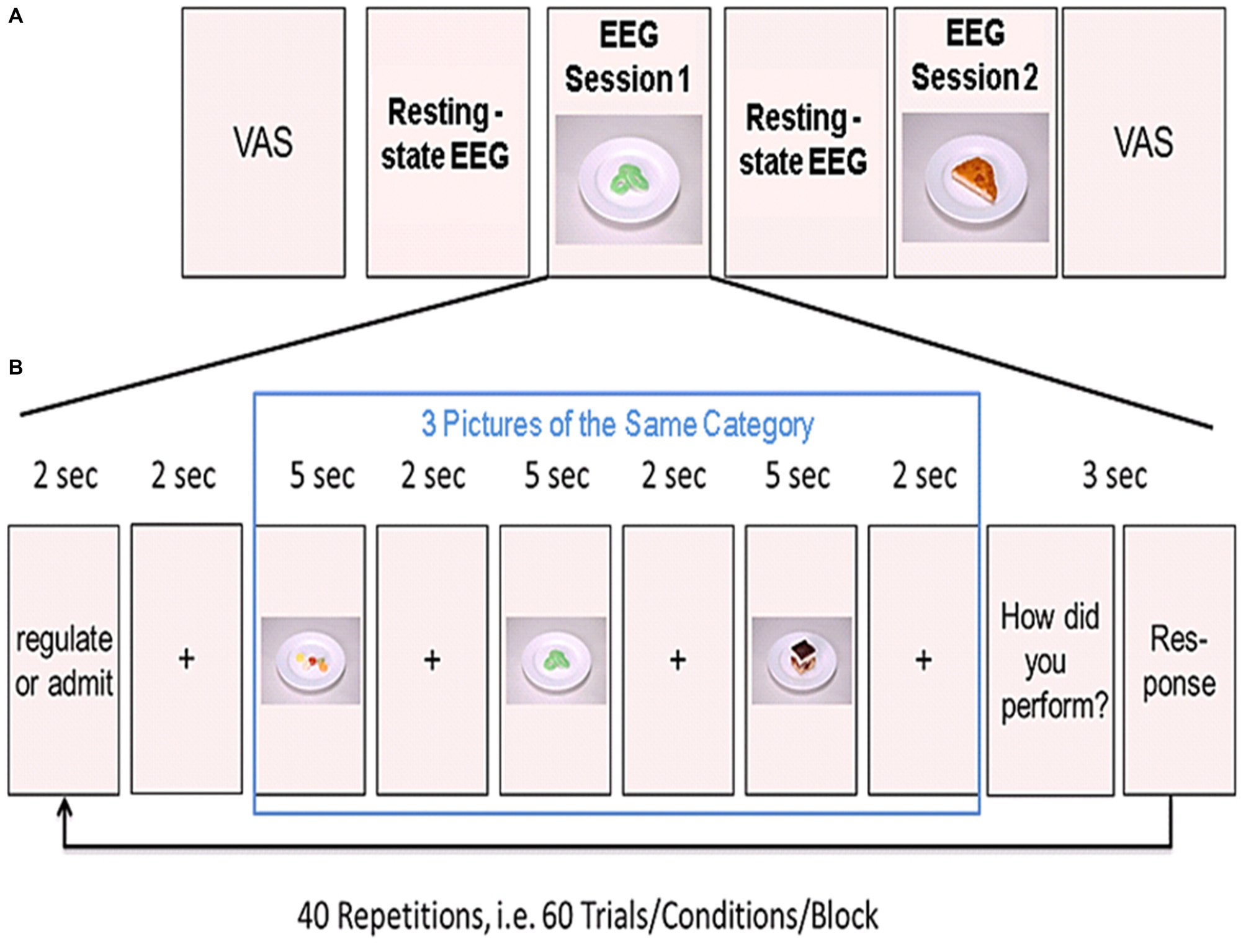 Experimental design. (A) Shown is the order of the two resting-state and the two experimental sessions. Before the first resting-state electroencephalogram (EEG) measurements, participants rated their tiredness, hunger, satiety, thirstiness, and stress levels on a visual analog scale (VAS). (B) Example of one block from the task-based EEG session. Three food pictures from one category (high or low calorie) were presented in a row. Prior to the presentation of the pictures, participants were instructed to either regulate or admit their desire for the upcoming food pictures. After presentation of the three pictures, participants rated their ability to either regulate or admit the desire for the three presented foods. This was repeated 20 times for each condition (regulate/admit), resulting in a total of 40 blocks.