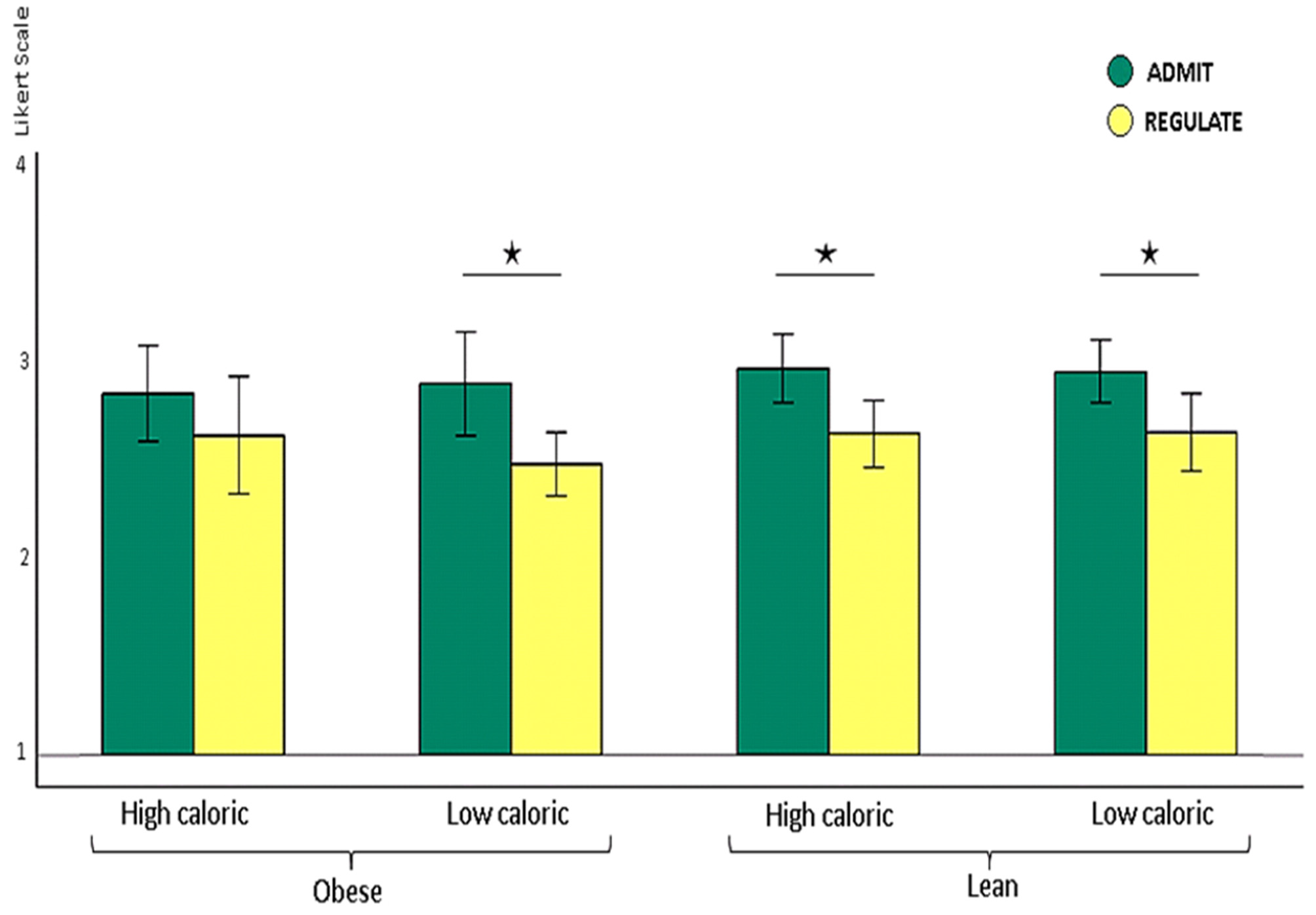 We found higher self-rating scores for the ADMIT as compared to the REGULATE condition for lean and obese participants together, across high and low calorie foods (ANOVA, p < 0.0001). Post hoc paired t-tests revealed that lean participants rated their performance better for admitting, relative to regulating their desire for food, irrespectively of whether this was high (p < 0.001) or low caloric (p < 0.009). Obese participants also rated their performance better for admitting, relative to regulating their desire for low calorie foods (p < 0.007). For high calorie foods, however, they unexpectedly rated their performance equally well (p > 0.2; Figure 2).
