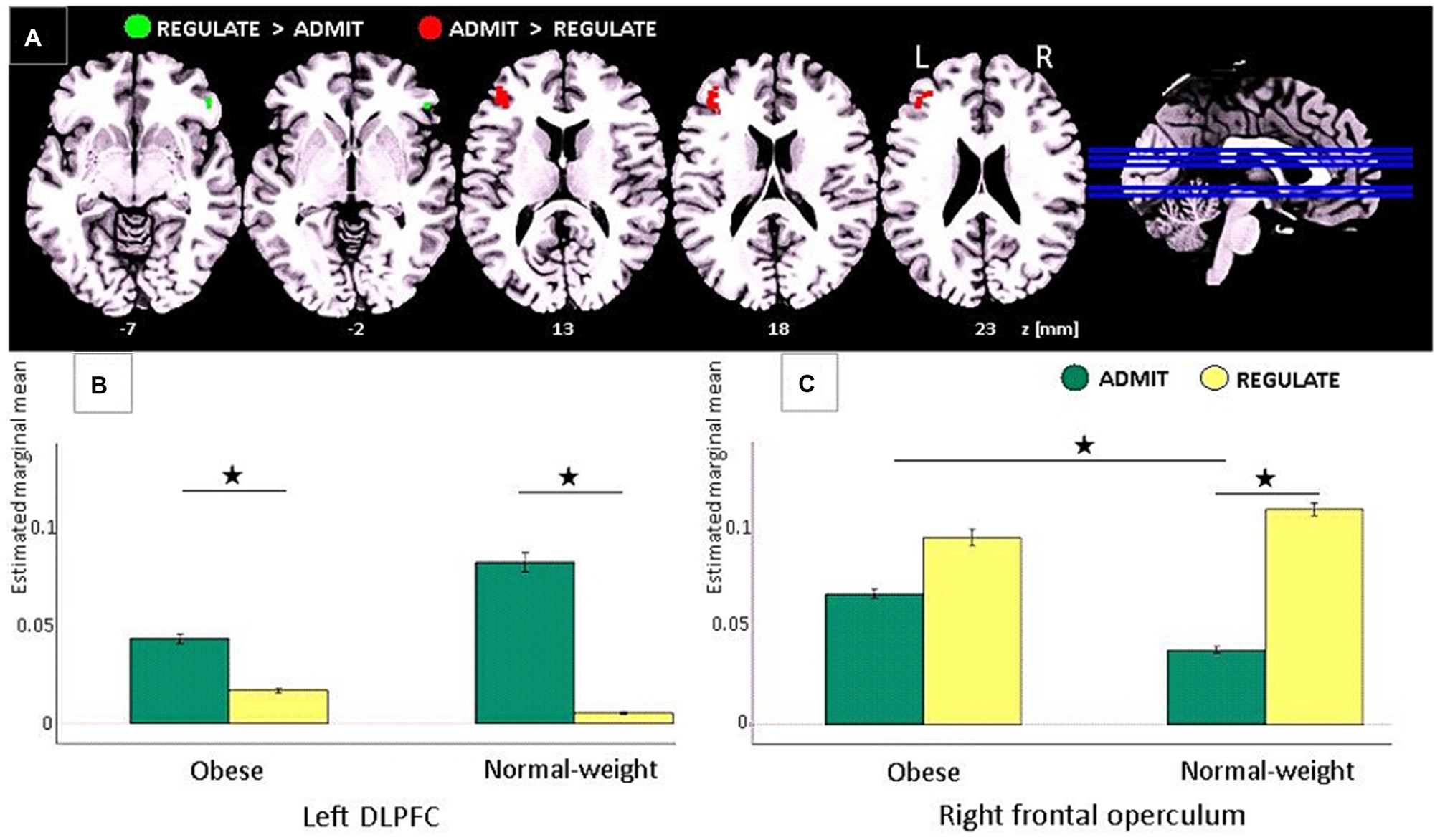 Task-based EEG results. (A) ADMIT > REGULATE (i.e., interaction between self-ratings and EEG activity) across lean and obese participants resulted in activation of the left dorsolateral prefrontal cortex (DLPFC; red cluster, family-wise error (FWE)-corrected, p < 0.05). REGULATE > ADMIT activated the right frontal operculum (green cluster, FWE-corrected, p < 0.05). “z” Indicates the MNI coordinates of the axial brain slices. “R” indicates the right and “L” the left brain hemisphere. (B) Bar plots show the estimated marginal means for REGULATE and ADMIT in the left DLPFC separately for lean and obese participants. (C) Bar plots show the estimated marginal means for REGULATE and ADMIT in the right frontal operculum separately for lean and obese participants. For (B,C) the whiskers index the standard errors and significance is marked with asterisks.