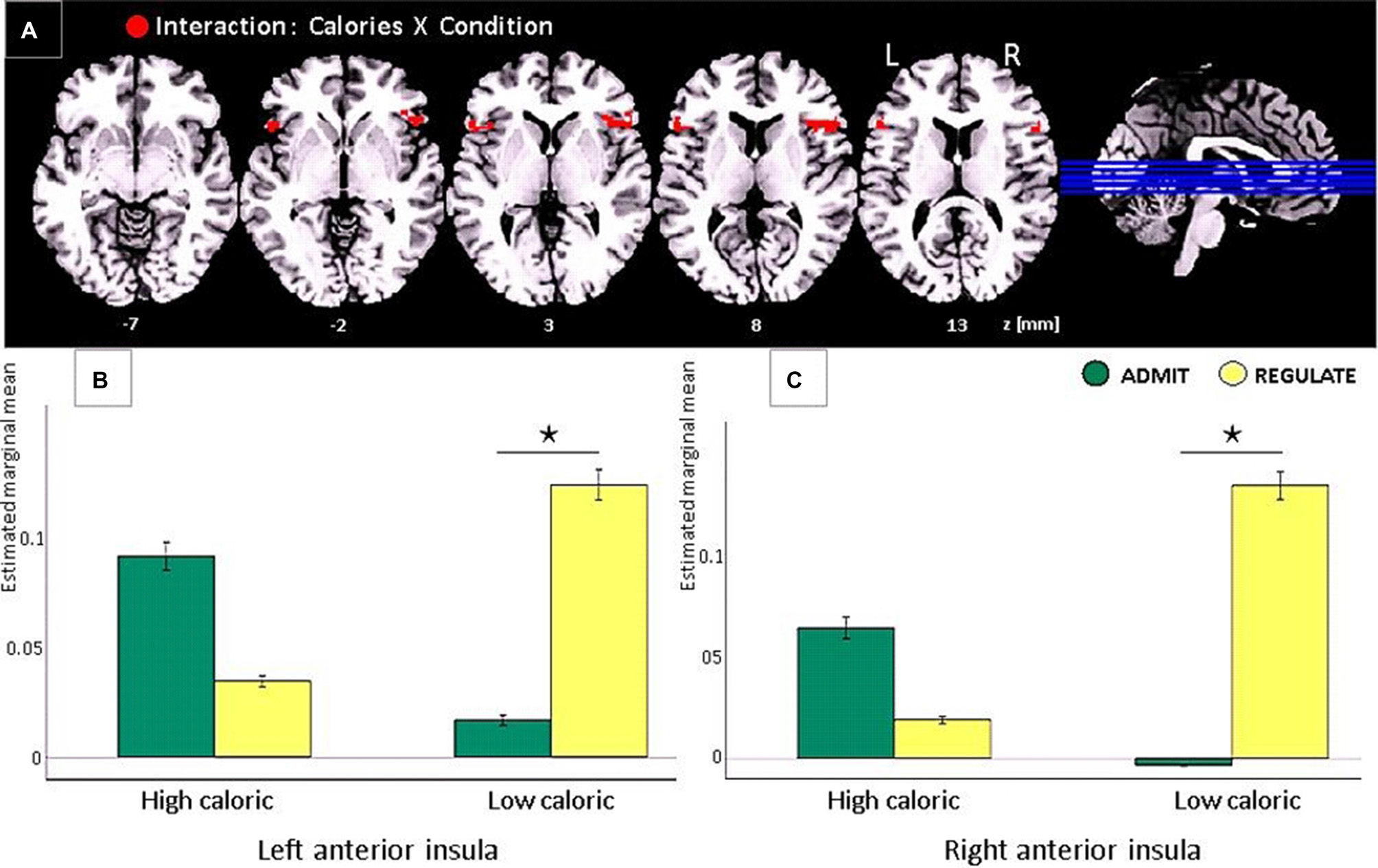 Task-based EEG results of the interaction between “calorie content” (high-caloric/low-caloric) and “condition” (admit/regulate, including the self-ratings as covariates) in lean participants only. Note that in obese participants the same comparison revealed no significant effects. (A) In lean participants we found activations in the anterior insular cortex in both hemispheres (red clusters, FWE corrected, p < 0.05). (B) Bar plots show the estimated marginal means for high and low calorie foods for either the REGULATE or the ADMIT condition in the left anterior insula. (C) Bar plots show the estimated marginal means in the right anterior insula, respectively. The whiskers indicate the standard errors and significance is marked with asterisks.