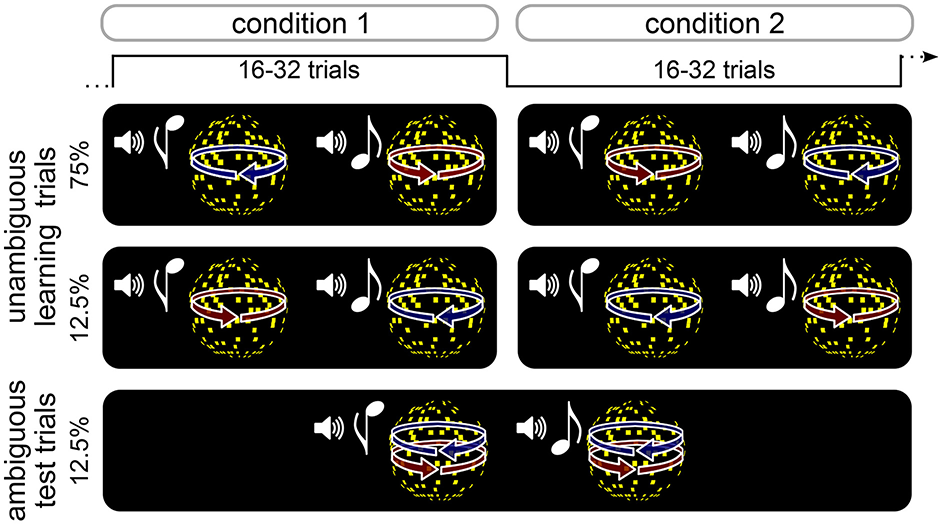 Participants performed a total of 576 trials divided in six runs. Tones and rotation directions were associated probabilistically, and the association was reversed between trial blocks consisting of 16, 24, or 32 trials (see Figure 1). In half of the trial blocks, 75% of all trials were unambiguous training trials in which the high-pitch tone was followed by a left-ward rotating sphere (and a low-pitch tone by right-ward rotating sphere), and 12.5% of the trials were unambiguous training trials the high-pitch tone was followed by a right-ward rotating sphere (and a low-pitch tone by left-ward rotating sphere). In the other half of trial blocks, unambiguous training trials were presented with reversed associations. In all trial blocks, 12.5% of the trials were test trials during which both high-pitch and low-pitch tones were followed by a sphere stimulus with ambiguous rotation direction. Participants were told that the relation between tones and rotation direction was probabilistic and that this probabilistic relation would change unpredictably over time. They were not informed about the intervals over which the probabilistic relation changed or about the occurrence of ambiguous stimuli. Trial order was pseudo-randomized, ensuring that ambiguous test trials were preceded by at least three unambiguous training trials with the currently more probable tone-rotation association.