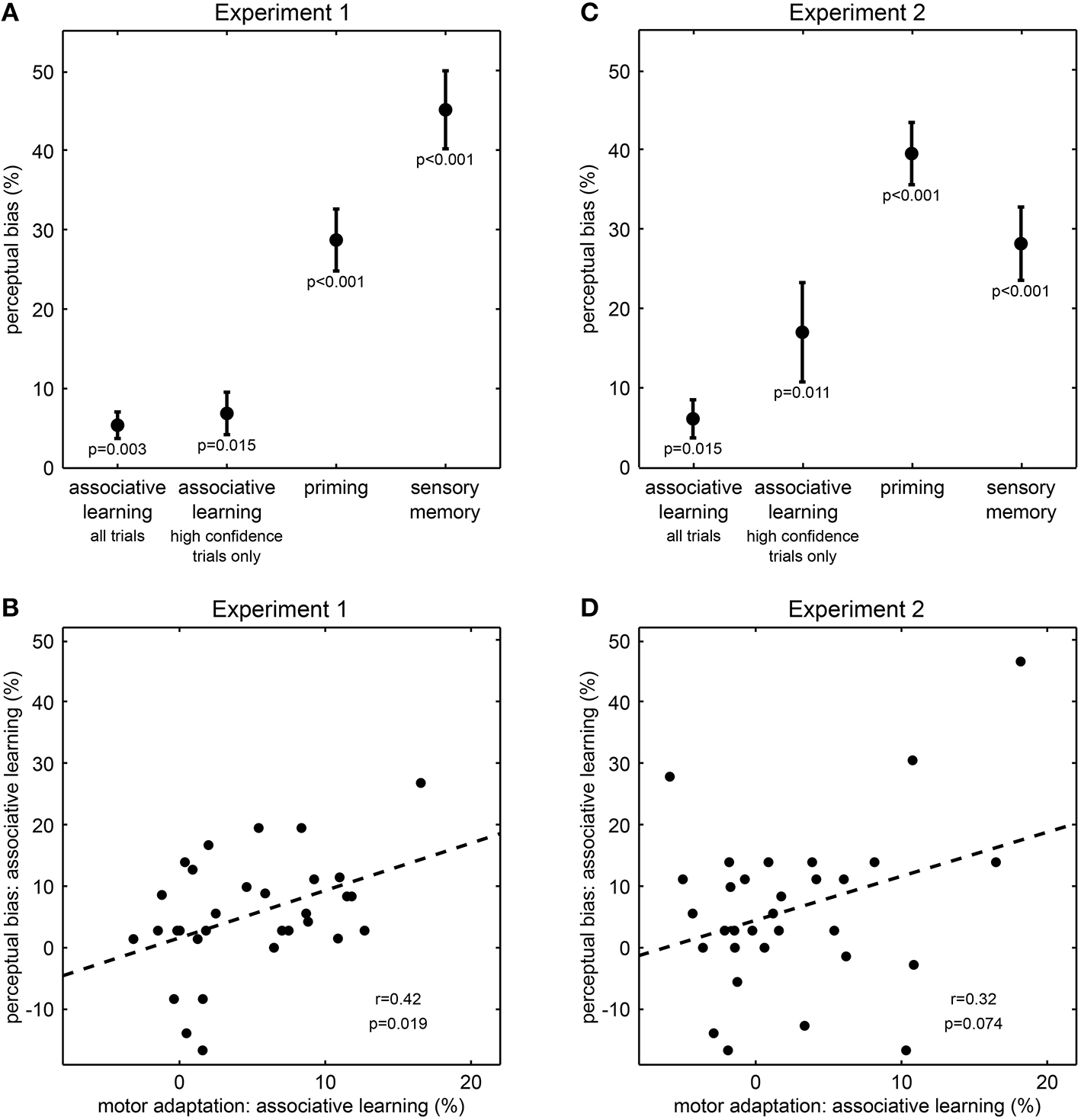 Results from Experiment 1 and Experiment 2. (A,C) Effect of perceptual expectations on visual perception (mean ± s.e.m.). Perceptual biases quantify the influence of perceptual expectations from associative learning, priming or memory on perception in ambiguous test trials. P-values result from one-sample t-tests. Please note that the influence of associative learning corresponds to effects of intermediate size (all Cohen's d > 0.5). (B,D) Correlation across participants between perceptual bias and motor adaptation for associative learning. Motor adaptation describes the effect of associative learning on reaction times in unambiguous training trials. Each dot represents one participant; the dashed line illustrates the fitted regression line; r- and p-values result from Pearson's product-moment correlations.