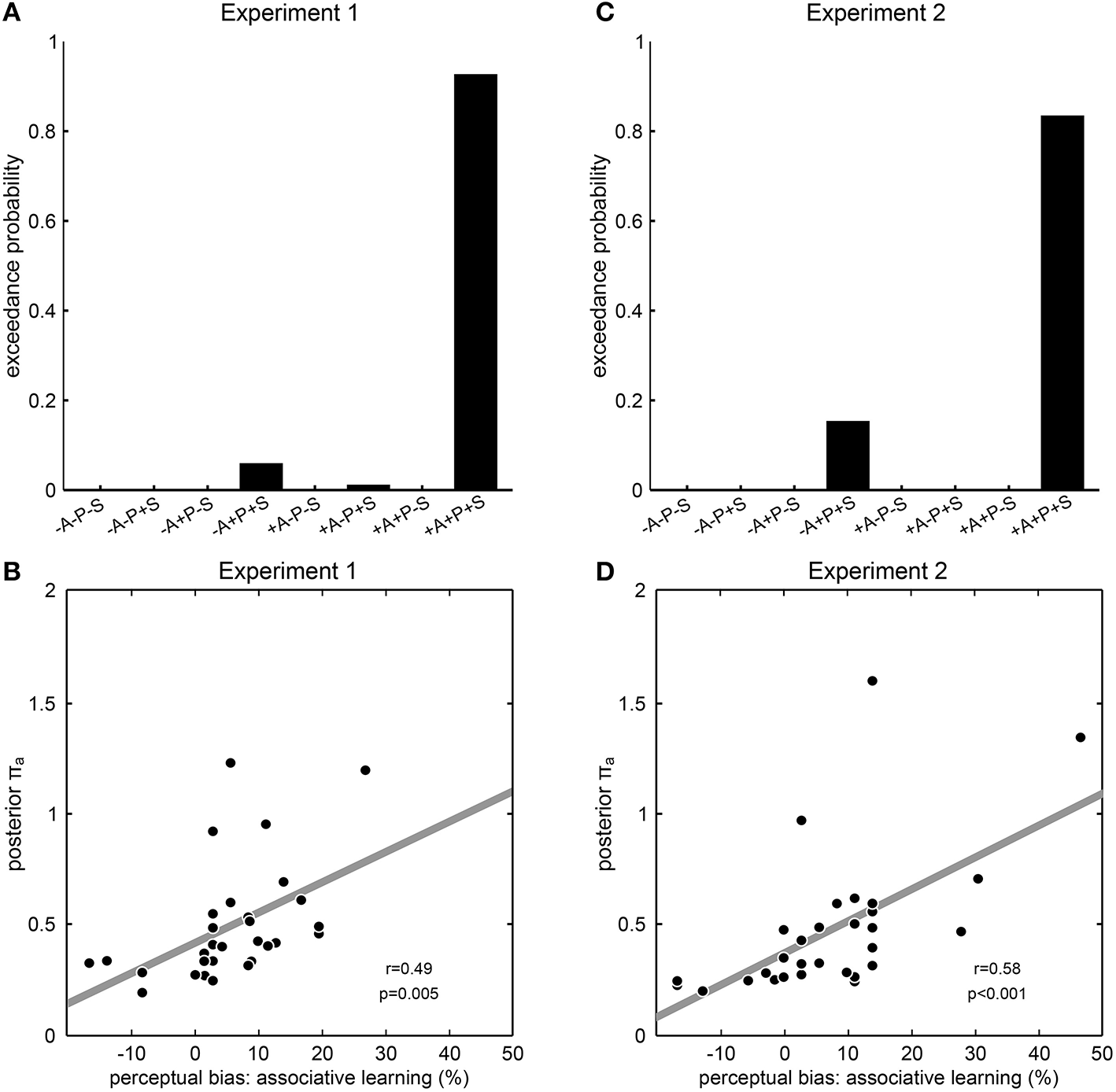 Modeling results from Experiment 1 and 2. (A,C) Results of model comparison. The model names at the y axis specify eight models with all possible combinations of the prior distributions “associative learning” (A), “priming” (P) and “sensory memory” (S), where “+” means that the corresponding prior distribution was included and “−” means that the corresponding prior distribution was excluded. Exceedance probabilities were derived by random-effects Bayesian model selection as implemented in SPM8. Exceedance probability refers to the probability that a model is more likely, at the group level, than any other model considered. In both experiments, the model +A+P+S including all prior distributions clearly outperformed all other models that lacked one, two or all of the prior distributions. (B,D) Correlation between model parameters and behavior. The posterior parameter estimates for the precision of the prior distribution “associative learning” from the winning model +A+P+S is correlated across participants with the perceptual bias induced by associative learning. Each dot represents one participant; the dashed line illustrates the fitted regression line; r- and p-values result from Pearson's product-moment correlations.